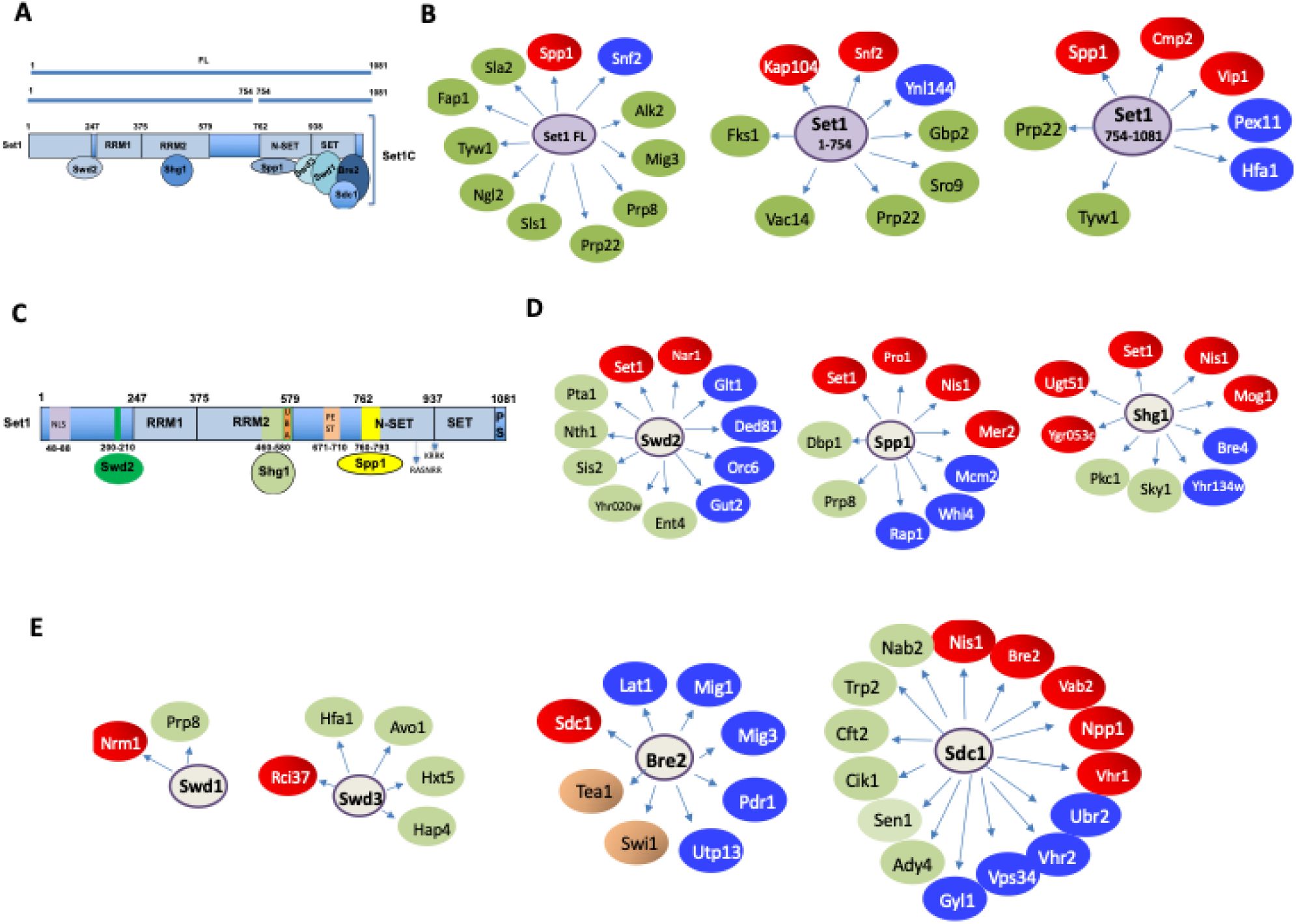AbstractSet1 is the catalytic subunit of SET1C or COMPASS, which methylates histone H3K4 and serves as a scaffold for the association of seven tightly bound polypeptides. We have employed yeast two-hybrid screenings to determine the interactome of Set1 and each subunit, providing a unique resource for exploring known and novel roles of the complex. Our screenings identified a multitude of interactors involved in chromatin regulation, DNA replication, meiotic breaks, and Ty transposition, processes previously associated with SET1C. Consistent with Set1 being an RNA-binding protein, the screens link SET1C to multiple aspects of RNA biogenesis, including pre-mRNA splicing and polyadenylation. The results reveal that Set1 interacts with several importins and with RGG motif-containing proteins, providing insights into the mechanisms by which Set1 moves between cytoplasmic and nuclear compartments. We demonstrate that the transcriptional corepressor Nrm1 is methylated by SET1C in vitro suggesting that H3K4-like domains may represent a class of non-histone substrates for SET1C. We further reveal that reconstituted SET1C interacts with the AT hook domain of the chromatin remodeler Snf2 and methylates multiple arginines within this domain. In vivo, we report that the ARTSTRGR AT-hook motif is methylated in a Set1-dependent manner revealing new interplay between lysine and arginine methylation.IntroductionPost-translational modifications of histones shape the chromatin landscape and provide essential mechanisms of regulating DNA accessibility, thereby controlling gene expression, genome maintenance and transmission. Multiprotein complexes of the SET/MLL family methylate histone H3 on lysine 4 (H3K4), which modulates multiple aspects of genome biology (Ruthenburg et al, 2007). Each complex contains additional factors specifying their recruitment to explicit chromatin domains and their specific biological effects (Cenik & Shilatifard, 2021). The budding yeast Set1 complex called COMPASS (for Complex of Proteins Associated with Set1) or SET1C has proved to be an excellent model to study the SET1/MLL family complexes. In Saccharomyces cerevisiae, all H3K4 methylation is carried out by SET1C that is composed of Set1, the catalytic subunit, acting as a scaffold for seven other components (Swd1 [RbBP5], Swd2 [WDR82], Swd3 [WDR5], Bre2 [ASHL2], Sdc1 [DPY30], Spp1 [CFP1] and Shg1 [BOD1]) (Nagy et al, 2002; Briggs et al, 2001; Roguev et al, 2001; Miller et al, 2001). Swd1, Swd3, Bre2 and Sdc1 copurify with the SET domain of Set1, yet none of these proteins can interact alone with the SET domain, suggesting that interactions between subunits are required for catalytic domain formation (Kim et al, 2013). The crystal structure of the SET domain of Set1 associated with Swd1, Swd3, Bre2, Sdc1 shows that the catalytic module is organized by Swd1, whose C-terminal tail nucleates Swd3 and a sub-complex formed by Bre2-Sdc1 (Qu et al, 2018; Hsu et al, 2018). For its side, Spp1 associates with the N-SET domain of Set1, while Shg1 binds to the central region of Set1 and Swd2 contacts the N-terminal region of Set1 (Kim et al, 2013; Roguev et al, 2001; Dehe et al, 2006; Halbach et al, 2009). Swd1 contacts Spp1 and also interacts with the N-terminal region of Set1, suggesting that the C- and N-terminal regions of Set1 may interact with each other (Qu et al, 2018; Acquaviva et al, 2013b; Jeon et al, 2018). Such SET1C organization was confirmed by cryo-electron microscopy and cross-linking experiments performed on the full-length complex (Wang et al, 2018). Interestingly, SET1C has a remarkable mode of assembly that is initiated in the cytoplasm while the nascent Set1 polypeptide emerges from the ribosome. Set1 is initially bound during its translation, by Shg1, Spp1 and Swd1, then Swd2, Swd3, Bre2 and Sdc1 associate with the initial pre-complex to form the full SET1C. This explains why Set1 is associated with its own mRNA (Luciano et al, 2017; Halbach et al, 2009).Swd2, the only essential SET1C subunit, is also part of the APT complex (for Pta1-associated), a subcomplex of the Cleavage Polyadenylation Factor (CPF) involved in the transcriptional termination of mRNA and snoRNA suggesting a functional link between SET1C and 3’ end formation/termination (Cheng et al, 2004; Nedea et al, 2003; Dichtl, 2004). Set1 has also been linked genetically to the Nrd1-Nab3-Sen1 (NNS) complex (Kim et al, 2006; Arigo et al, 2006), but intriguingly, it was reported to have two seemingly contradictory effects on ncRNA termination: on the one hand Set1 was suggested to promote efficient snoRNA termination mediated by Nrd1 (Terzi et al, 2011), and on the other hand it appeared to interfere with the early termination of a large number of ncRNAs (Castelnuovo et al, 2014; Margaritis et al, 2012). Interestingly, various lysines distributed between Nrd1, Nab3 and Sen1, are methylated, notably lysine 363 in the RNA Recognition Motif (RRM) of Nab3 whose mono methylation depends on Set1 and Set3 (Lee et al, 2020).Set1 interacts co-transcriptionally with the RNA polymerase II Carboxy Terminal Domain (PolII CTD) phosphorylated on Ser5 of the heptad repeats, producing an H3K4 methylation gradient that starts at nucleosome +1 and fades away from the promoter (Soares et al, 2017; Ng et al, 2003). It was recently shown that the N-terminal region of Set1 and Swd2 interact cooperatively with the CTD (Carboxy Terminal Domain) of Rbp1 (RNA polymerase II large subunit) promoting SET1C recruitment to transcription elongation complexes at the 5′ ends of genes (Bae et al, 2020). Deletion of residues 200-210 of Set1 abolishes interaction with the Rpb1-CTD and Swd2, while deletion of the first 200 amino acids of Set1 strongly reduces trimethylation of H3K4 (H3K4me3) at the 5’ end of transcribed genes (Bae et al, 2020). Interestingly, Swd2 is ubiquitinated by Rad6/Bre1 and preventing Swd2 ubiquitination affects H3K4 trimethylation with a concomitant reduction in 