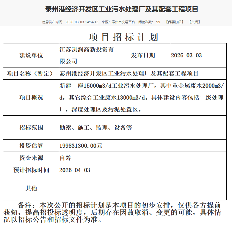 3月3日,贵州省黔南州独山县城南污水处理厂特许经营项目招标公告发布。 该项目总投资:2992.72 万元,特许经营期限为 40 年(其中建设期 2 年,运营期 38 年)。采用建设—运营—移交(BOT)实施。 招标内容:通过公开招标选定特许经营者;中标特许经营者与招标人签订《特许经营初步协议》,约定由中标特许经营者全资成立项目公司;项目公司与招标人签订《特许经营协议》后,招标人授予项目公司对本项目进行投资建设、运营维护、移交等在本项目合作范围内的特许经营权,由项目公司负责本项目的投资、融资、设计、建设、运营维护等全过程工作。 建设内容: (1)新建城南污水处理厂 1 座,日处理规模0.6万吨,排放标准执行《城镇污水厂污染物排放标准》(GB18918-2002)中的一级 A 标。 (2)新建污水管网 3650m,其中,大学城片区DN200压力管道280m、DN400沿河管1575m;凉亭至城南污水处理厂DN500沿河管道1460m,定向钻穿越管道335m。 详情如下: 贵州省黔南州独山县城南污水处理厂特许经营项目招标公告 1.招标条件 本项目贵州省黔南州独山县城南污水处理厂特许经营项目已由独山县人民政府以独府专议〔2025〕240号、独府函[2025]76号批准,招标人为独山县水务局。该项目已具备招标条件,现对该项目的特许经营进行公开招标。 2.项目概况与特许经营范围 2.1 项目地点:贵州省黔南布依族苗族自治州独山县县城小河桥东北侧(县城区域总规规划厂址、黔南蓝天炉业有限公司对面); 2.2 总投资:2992.72 万元; 2.3 特许经营期限:为 40 年(其中建设期 2 年,运营期 38 年),最终以发改立项批复为准。 2.4 实施方式:建设—运营—移交(BOT); 2.5 招标内容:通过公开招标选定特许经营者;中标特许经营者与招标人签订《特许经营初步协议》,约定由中标特许经营者全资成立项目公司;项目公司与招标人签订《特许经营协议》后,招标人授予项目公司对本项目进行投资建设、运营维护、移交等在本项目合作范围内的特许经营权,由项目公司负责本项目的投资、融资、设计、建设、运营维护等全过程工作。 采用建设—运营—移交(BOT)方式实施,由特许经营者负责新建内容的投资、融资、设计、建设、运营维护,本级财政给予的运营服务费补贴收回投资并获得合理利润。 2.6 建设内容: (1)新建城南污水处理厂 1 座,日处理规模0.6万吨,排放标准执行《城镇污水厂污染物排放标准》(GB18918-2002)中的一级 A 标。 (2)新建污水管网 3650m,其中,大学城片区DN200压力管道280m、DN400沿河管1575m;凉亭至城南污水处理厂DN500沿河管道1460m,定向钻穿越管道335m。 3.投标人资格要求 3.1 本次招标要求投标人须具备下列资格: (1)具有独立承担民事责任的能力:提供法人或者其他组织的营业执照等证明文件,自然人投标的提供身份证明(联合体投标的,联合体各方均提供)。 (2)具有良好的商业信誉和健全的财务会计制度:提供2024年度经第三方审计的财务报告,成立不足一年的公司、其他组织或自然人,提供验资报告或银行2025年内出具的资信证明(有效期内)(联合体投标的,联合体各方均提供)。 (3)具有履行合同所必需的设备和专业技术能力:自行承诺具备履行合同所必需的设备和专业技术能力(承诺函自拟)(联合体投标的,联合体各方均提供)。 (4)具有依法缴纳税收和社会保障资金的良好记录: ①提供2025年至今任意三个月缴纳税收的凭据或证明材料(依法免税的,提供有效的证明文件); ②提供2025年至今任意三个月社会保障资金缴纳证明材料(不需要缴纳社保资金的,提供有效的证明文件)。(联合体投标的,联合体各方均提供) (5)参加招标投标活动前三年内,在经营活动中没有重大违法记录:提供参加招标投标活动前三年内在经营活动中没有重大违法记录的承诺函。(联合体投标的,联合体各方均提供)。 (6)法律、行政法规规定的其他条件: ①投标人须承诺:在“信用中国”网站(.cn)、中国政府采购网(.cn)等渠道查询中未被列入失信被执行人名单、重大税收违法案件当事人名单、政府采购严重违法失信行为记录名单中,如被列入失信被执行人、重大税收违法案件当事人名单、政府采购严重违法失信行为记录名单中的投标人取消其投标资格,并承担由此造成的一切法律责任及后果。②根据《省发展改革委省法院省公共资源交易中心关于推进全省公共资源交易领域对法院失信被执行人实施信用联合惩戒的通知》黔发改财金【2020】421号文件要求,交易系统会自行对失信投标人实施信用联合惩戒。(联合体投标的,联合体各方均提供) 3.2 本次招标接受联合体投标。联合体投标的应满足下列要求: (1)联合体内的成员数量不得超过 2 名,联合体成员均须出资,其中民营企业持股比例不低于35%。 (2)提供联合体协议书,明确联合体各方股权比例、联合体牵头人和各方权利义务。 (3)联合体各方不得再以自己名义单独或参加其他联合体在本招标项目中投标。 (4)联合体牵头人负责缴纳投标保证金、递交投标文件。 (5)联合体将严格按照招标文件的各项要求,递交投标文件,履行合同,并对外承担连带责任,同时联合体各方承诺按照出资比例完成出资义务。 4.招标文件的获取 4.1凡有意投标者,请于2026年03月04日00时00分至2026年03月09日23时59分,登录全国公共资源交易平台(省/市中心)网上获取(交易中心网址:http://61.189.224.38:8888/TPBidder/memberLogin)下载电子招标文件。 4.2 招标文