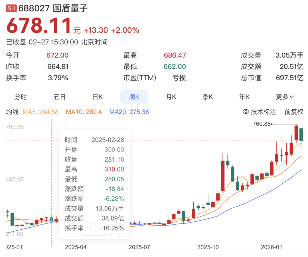 截止发稿,国盾量子市值为697.51亿元。相比一年之前,国盾量子股价大涨超过140%。自2024年初以来,国盾量子累计涨幅超过400%。