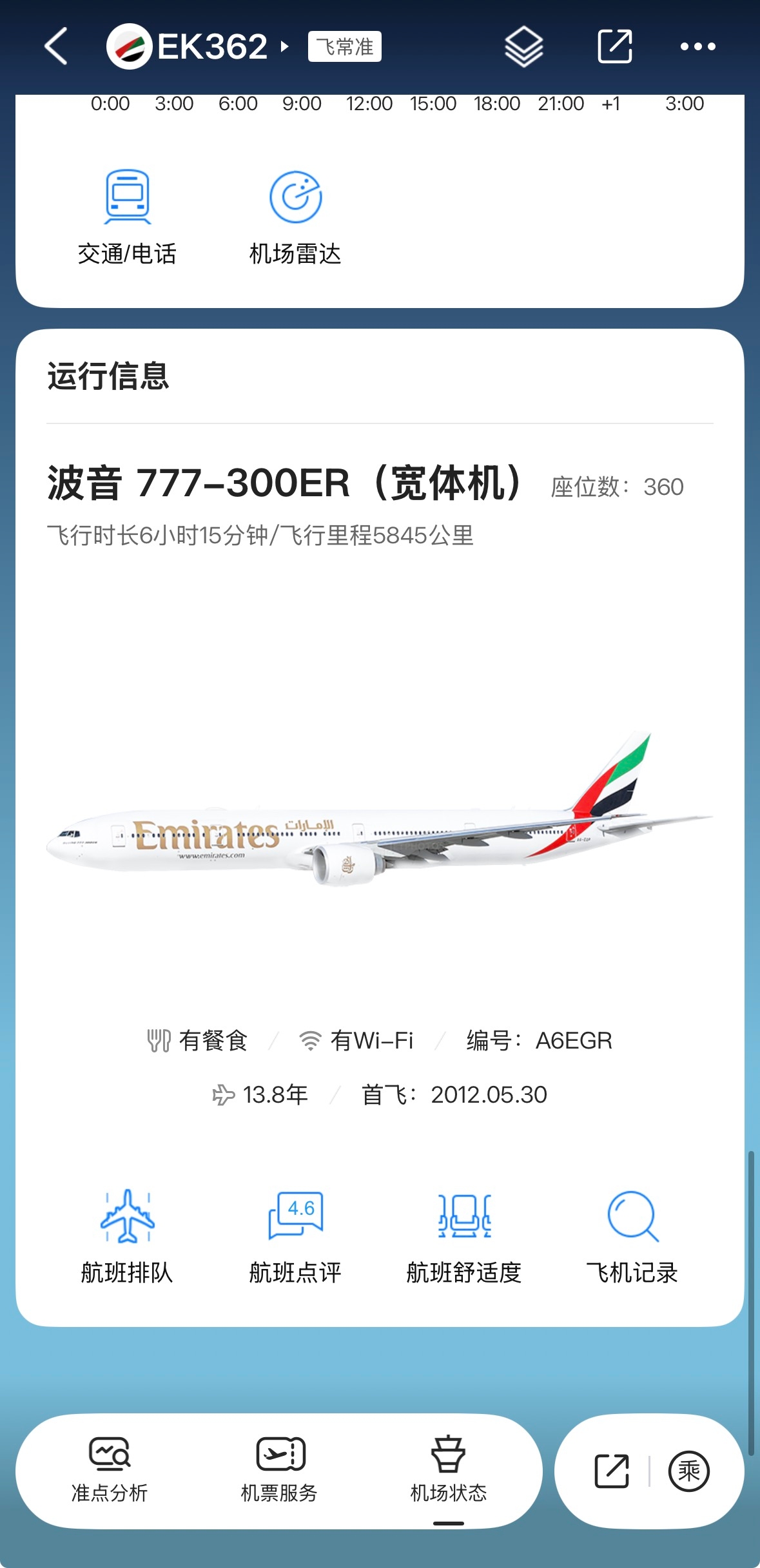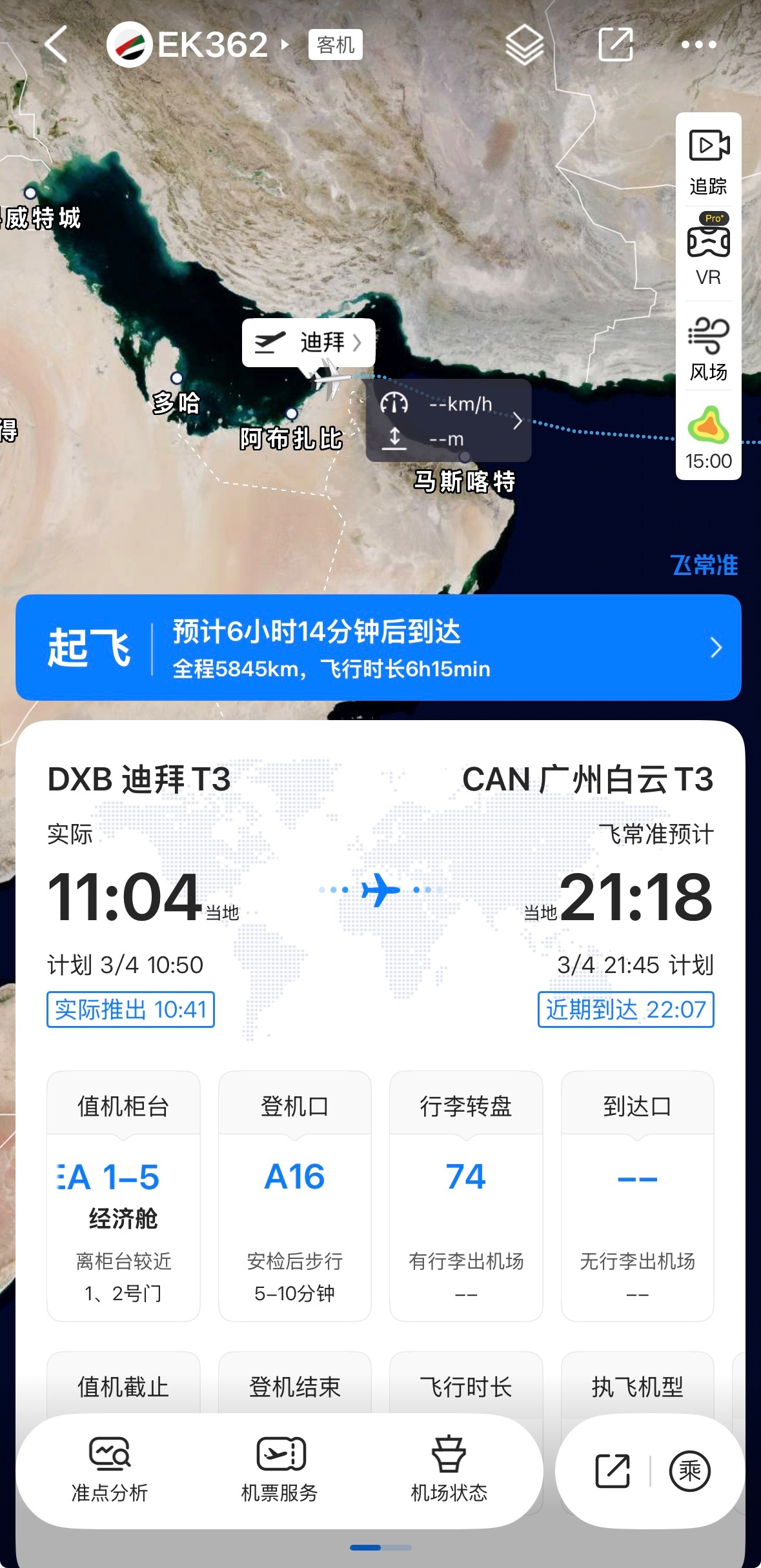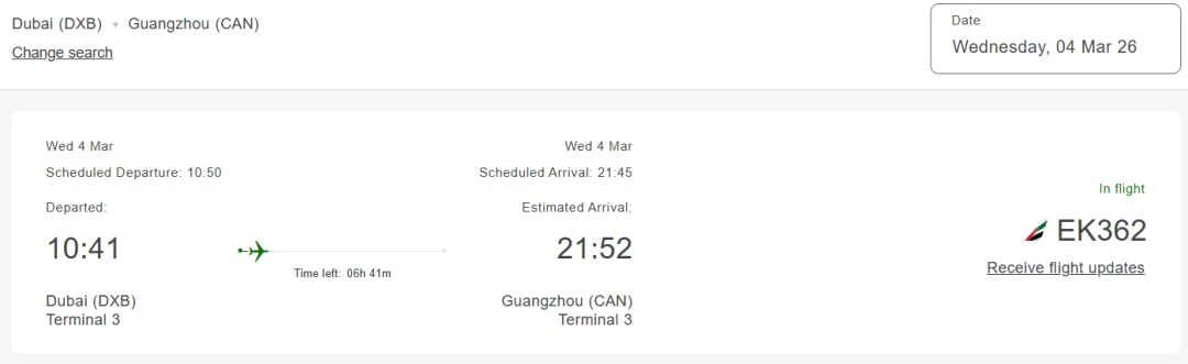 在阿联酋航空官网的航班动态查询中显示,EK362已经从迪拜国际机场起飞,预计21:52抵达广州。