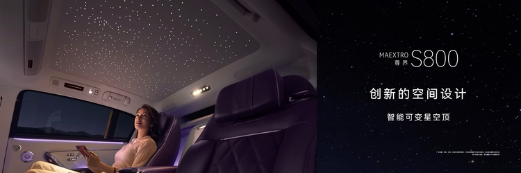 智能可变星空顶[11],呈现满天星光、北斗七星与流星雨特效。智能追光系统[12],追光灯分区布局点亮仪式感。尊界S800行政四座后排采用轿车级双零重力座椅布局,配备ActiveSafe双零重力座椅,创新主动安全设计,联动ADS自主调整座椅姿态。