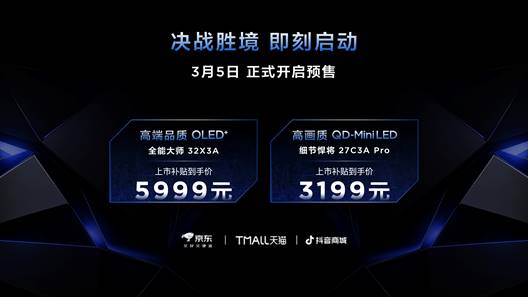 通往“胜境”的大门已经开启。“全能至臻”32X3A上市首发价5999元,“细节悍将”27C3A Pro上市首发价3199元,即日起在TCL官方商城及各大合作平台开启预售。本次发布不止于三款旗舰产品,而是一个完整的系列产品。除了作为标杆的X3A、C3A Pro和P2A Ultra,每个系列旗下都提供不同尺寸、不同规格配置的版本,无论需求选择如何、桌面空间多大、功能侧重有何不同,都能在TCL显示器中找到最适合的那一款。