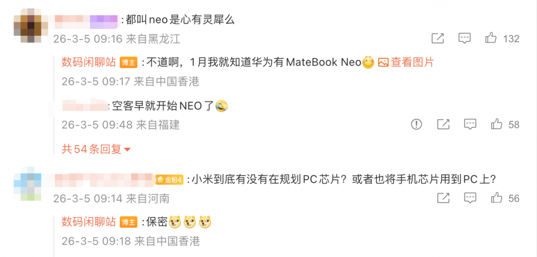 在评论区,有网友留言,华为、苹果的新版笔记本“都叫neo是心有灵犀么”,该博主回复称,“1月我就知道华为有MateBook Neo”。