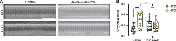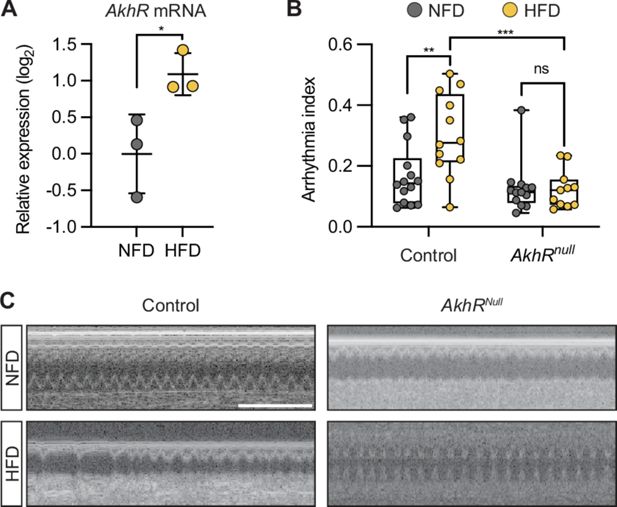 is an established model to study metabolic diseases and cardiac arrhythmias. Since glucagon signaling is highly conserved, we used high-fat diet (HFD)-fed flies to study its effect on heart function. HFD led to increased heartbeat and an irregular rhythm. The HFD-fed flies showed increased levels of adipokinetic hormone (Akh), the functional equivalent to human glucagon. Both genetic reduction of Akh and eliminating the Akh-producing cells (APC) rescued HFD-induced arrhythmia, whereas heart rhythm was normal in Akh receptor mutants (