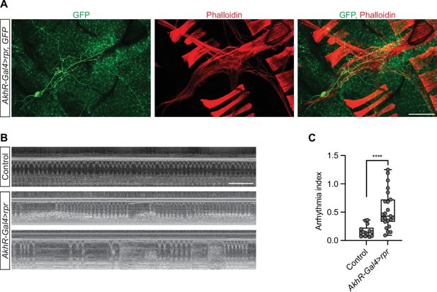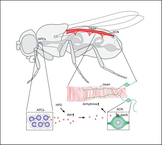 ). Furthermore, we discovered a pair of cardiac neurons that express high levels of Akh receptor. These are located near the posterior heart, make synaptic connections at the heart muscle, and regulate heart rhythm. Altogether, this Akh signaling pathway provides new understanding of the regulatory mechanisms between metabolic disease and cardiac arrhythmia.