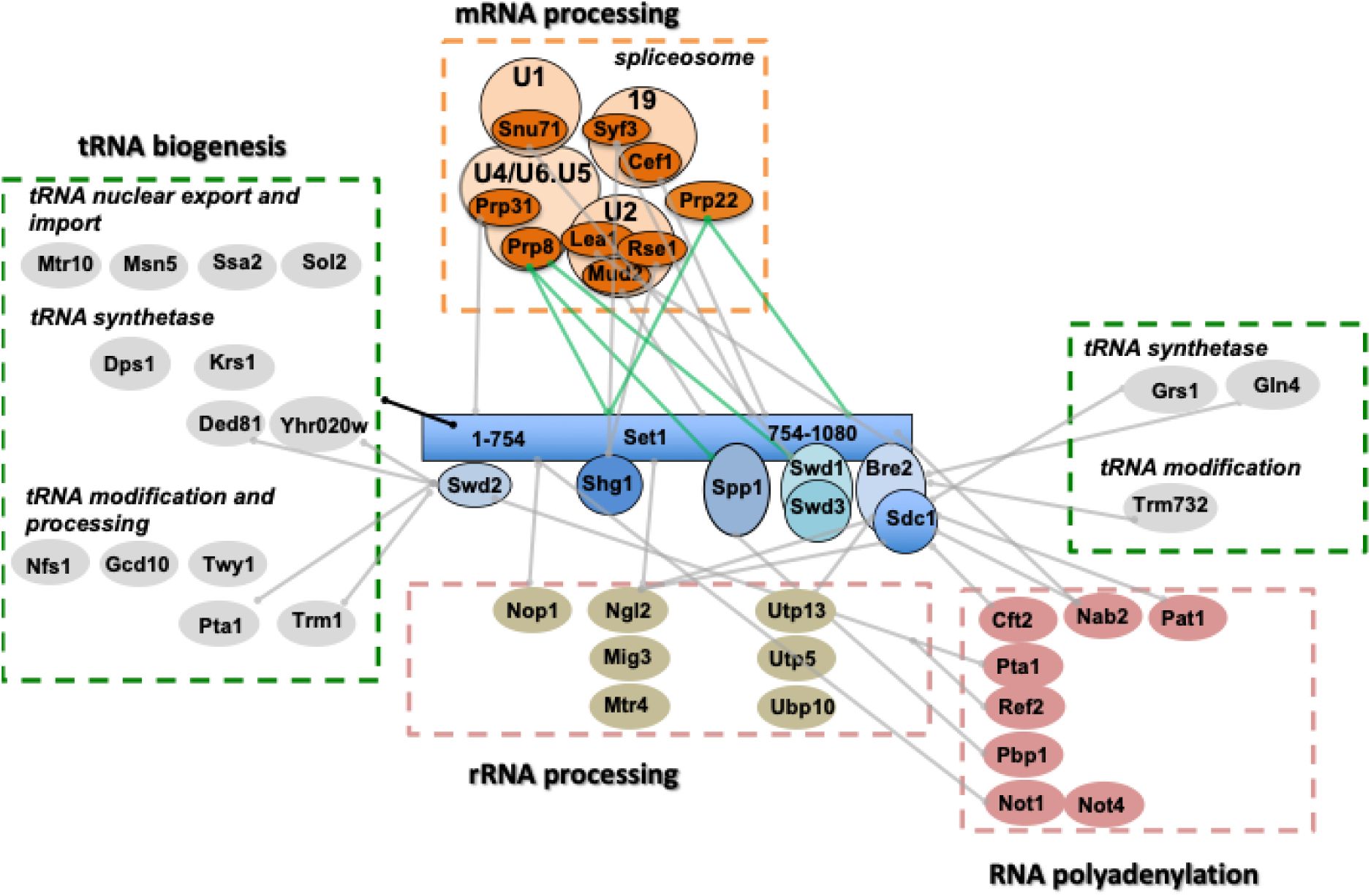 ). Both the N-SET domain and Spp1 also contribute to Set1 binding to RNA. Set1 associates post-transcriptionally with transcripts produced by specific classes of genes including snRNA, Ty1 and a number of genes involved in adaptive responses (