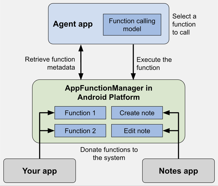 AppFunctions 的逻辑是,App 开发者在代码里标注哪些功能可以被 AI 调用,比如"创建日历事件"、"搜索照片"。这些声明被编译成索引文件,提交给安卓系统。Gemini 收到用户指令,先查索引,找到匹配功能,在设备本地直接调用,全程不经过外部服务器。
