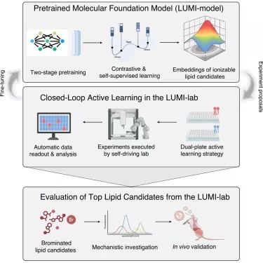 LUMI-lab得到了多伦多大学加速联盟的AC转化研究资助,它将一个分子基础模型与自动化机器人系统相结合。出乎研究团队的意料,它发现了一类新型的增强mRNA的脂质——溴化脂质尾,是提高转染效率的主要增强剂。