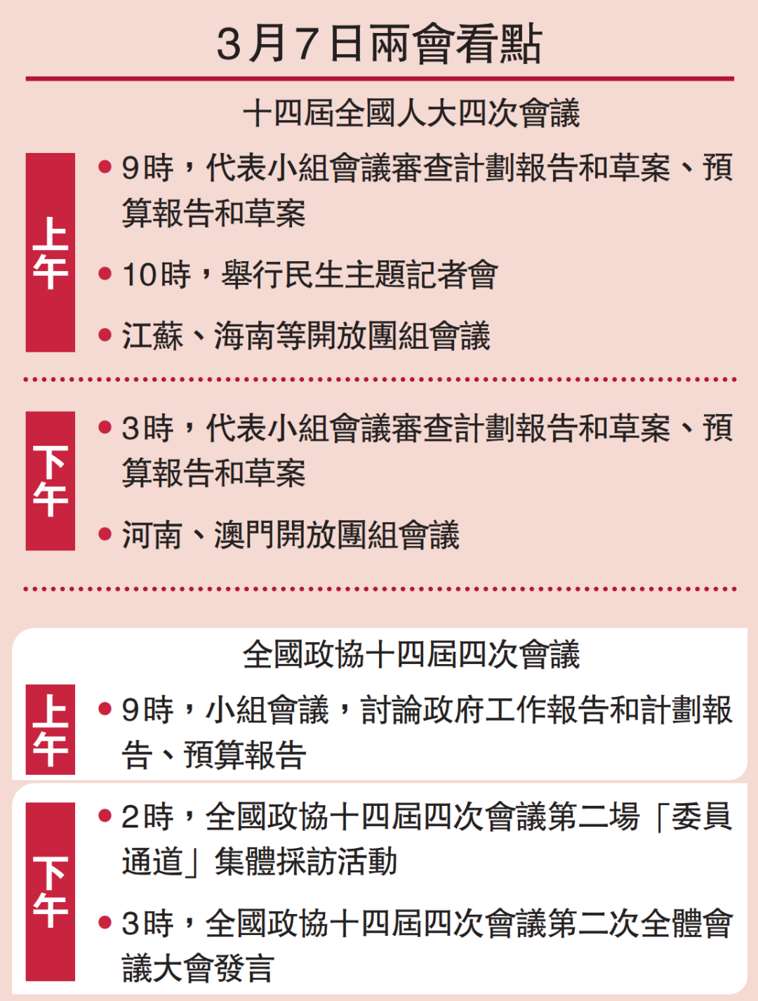 4.十四屆全國人大四次會議將於今天上午10時舉行民生主題記者會。