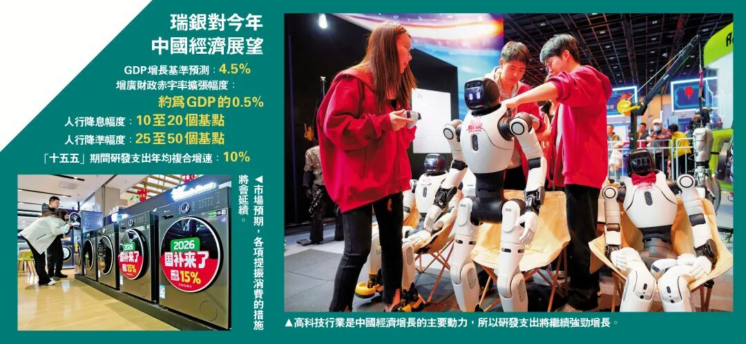 4.瑞銀證券表示,維持2026年國內生產總值(GDP)增長4.5%的基準預測,但預計政府將盡量取得近5%經濟增長。