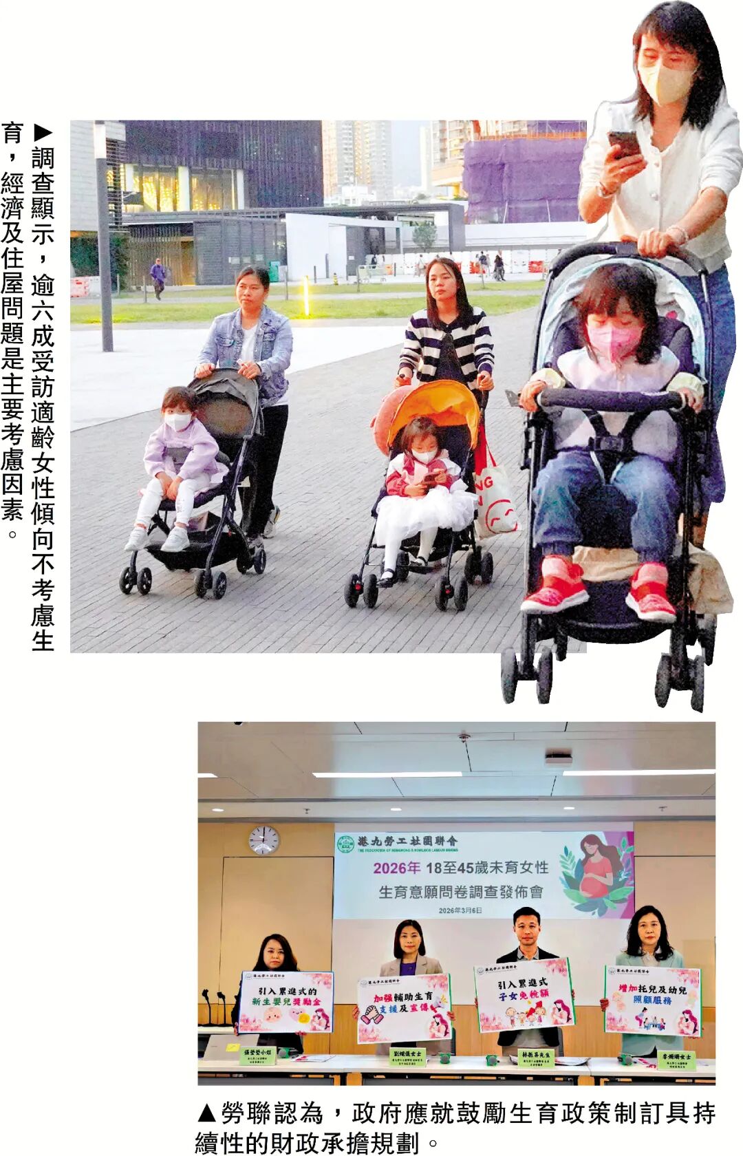 2.勞聯婦女委員會公布調查結果顯示,逾六成受訪適齡女性傾向不考慮生育,勞聯建議政府增設育兒津貼。