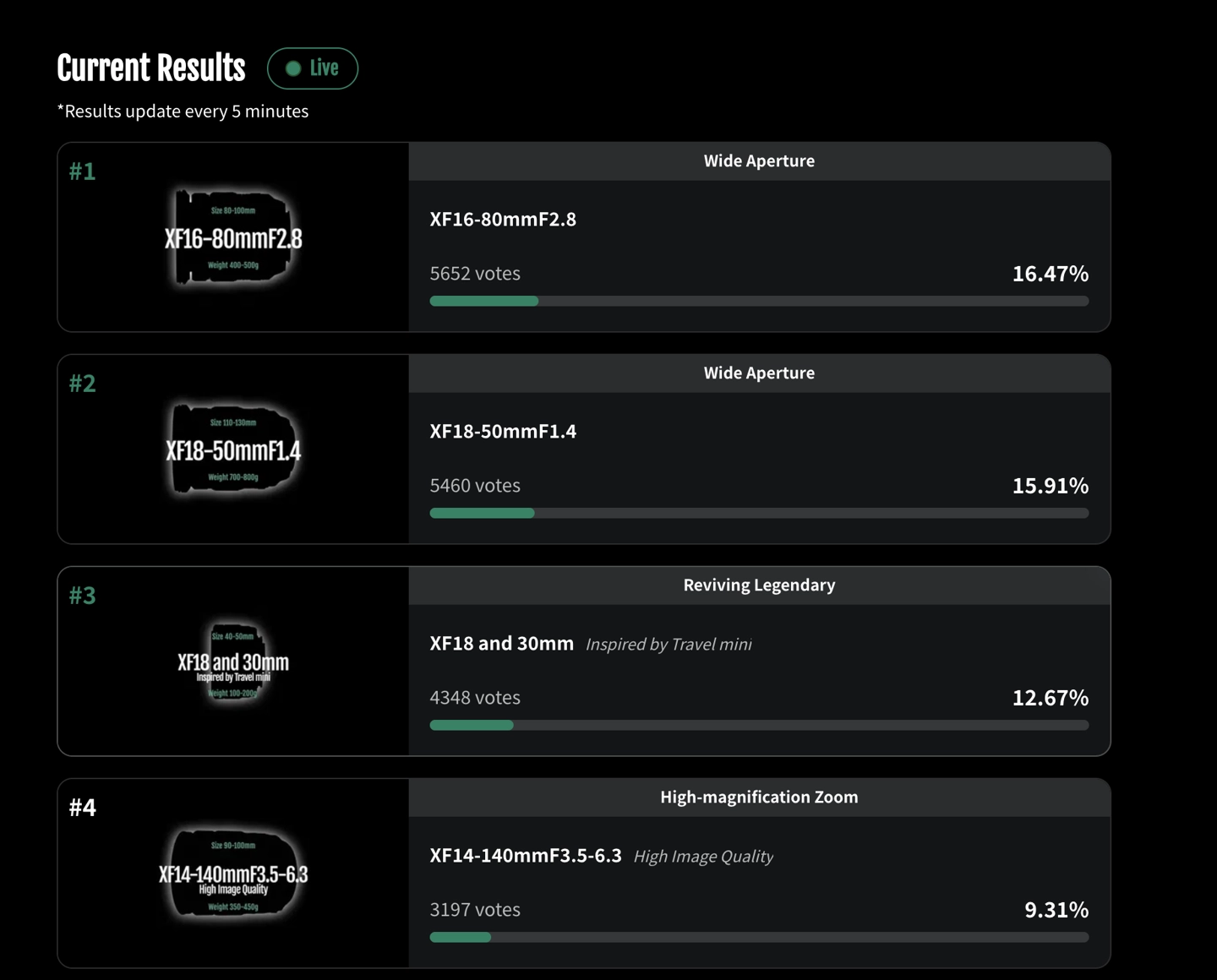 每位用户可以在查看镜头的详细信息后,从 14 款概念镜头中选出自己最想要的 3 款。同时富士还提供了实时投票结果,数据 5 分钟更新一次,显示用户对 XF 18-50mm f/1.4、XF 16-80 f/2.8 等大光圈变焦镜头最感兴趣。