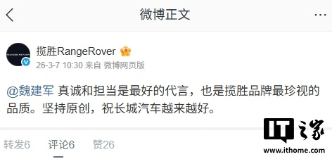 今日,揽胜 RangeRover 官方微博公开发布回应:真诚和担当是最好的代言,也是揽胜品牌最珍视的品质。坚持原创,祝长城汽车越来越好。