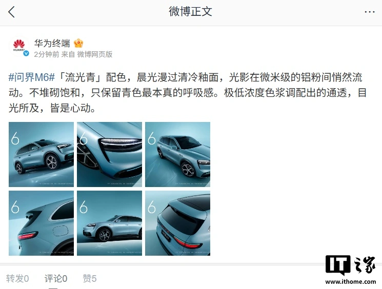参考IT之家此前报道,华为终端 BG 董事长余承东于 2 月 27 日宣布问界 M6 全色系登场,提供橙、白、黑、银、青、紫、蓝等多款车色。