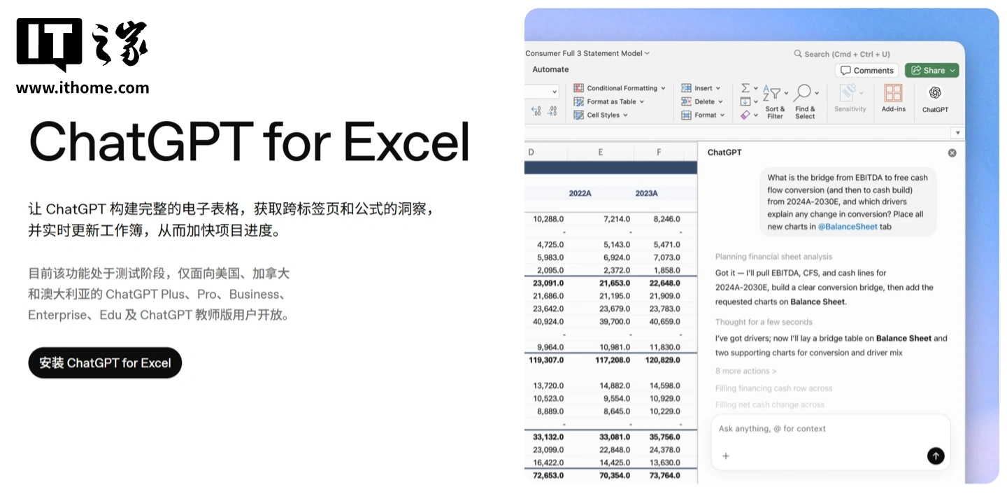 OpenAI 发布 ChatGPT for Excel 测试版,支持大白话操控表格