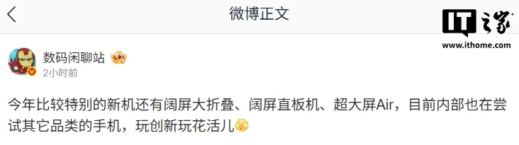 3 月 7 日消息,博主 @数码闲聊站 今日爆料,某厂今年比较特别的新机还有阔屏大折叠、阔屏直板机、超大屏 Air,目前内部也在尝试其它品类的手机。结合该博主的爆料习惯,评论区网友推测为华为品牌。