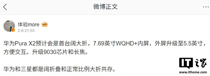 :7.69 英寸 WQHD+ 内屏、外屏升级至 5.5 英寸,方便交互。另外,该机还会升级麒麟 9030 芯片和长焦。
