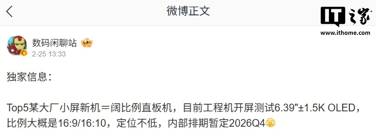 IT之家注意到,该博主上个月曾爆料,Top5 某大厂小屏新机=阔比例直板机,