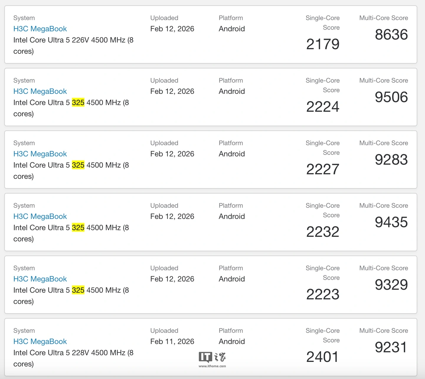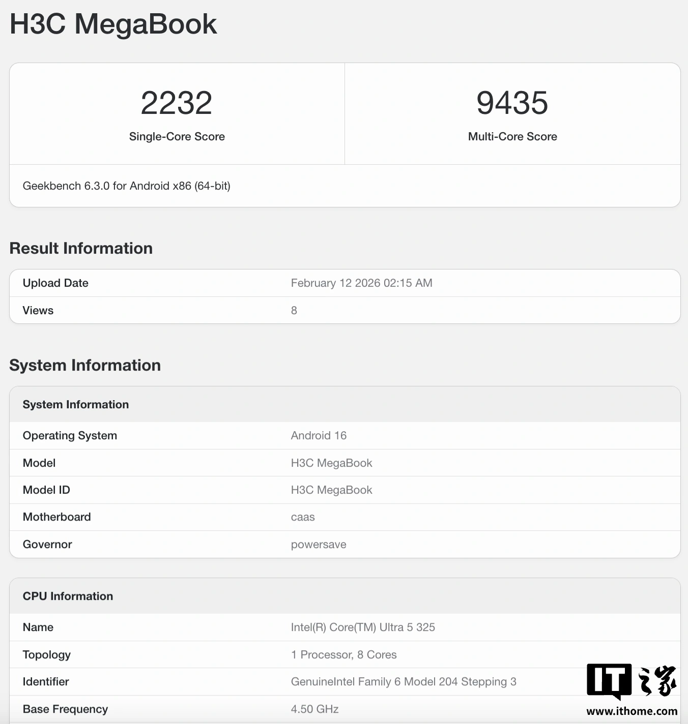 Geekbench 数据显示,新华三的新款 MegaBook 搭载英特尔酷睿 Ultra 5 325 处理器,采用 8 核设计,最高频率 4.5GHz,最高搭载 32GB 内存。单核成绩最高 2232 分、多核最高 9435 分。