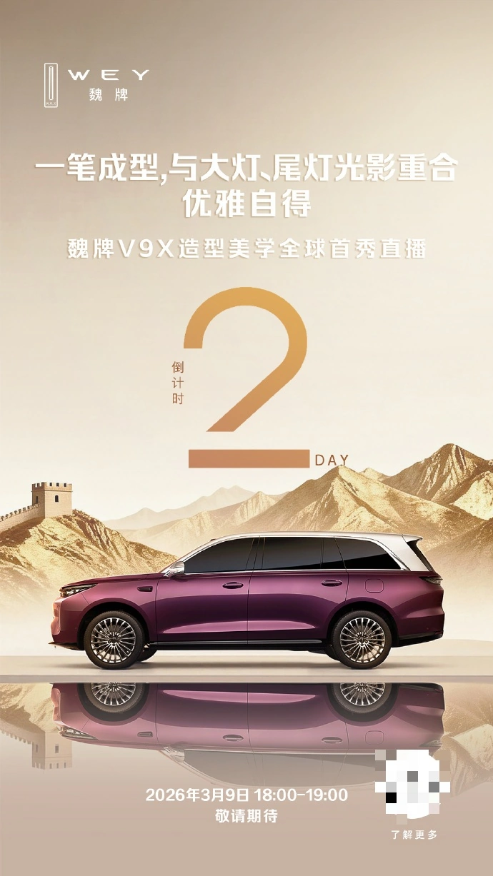 3 月 7 日消息,长城汽车宣布,魏牌 V9X 造型美学全球首秀直播将于 3 月 9 日 18:00-19:00 举行。值得一提的是,该车由长城汽车董事长魏建军担任代言人。