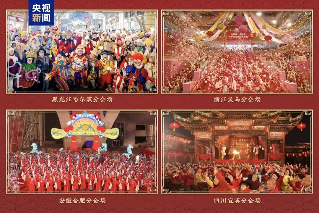 馬年春晚哈爾濱、義烏、合肥、宜賓四個分會場展現了各自獨特的魅力。黑龍江哈爾濱分會場將精巧玲瓏的藝術造型與冰雪大世界的壯闊景觀深度融合,觀眾置身其中盡享冰天雪地裏的火熱中國年;浙江義烏分會場中外交融的歌舞中流淌着義烏「廣交天下客」的滾燙熱情,充盈着各美其美、美美與共的氛圍;安徽合肥分會場以「合」為脈絡,將煙火溫情、江淮文脈與科創鋒芒完美融合,突顯向新而行的磅礴氣勢;四川宜賓分會場三江六岸全民歡歌,微光匯成星河,勾勒出長江上游城市的幸福圖景。