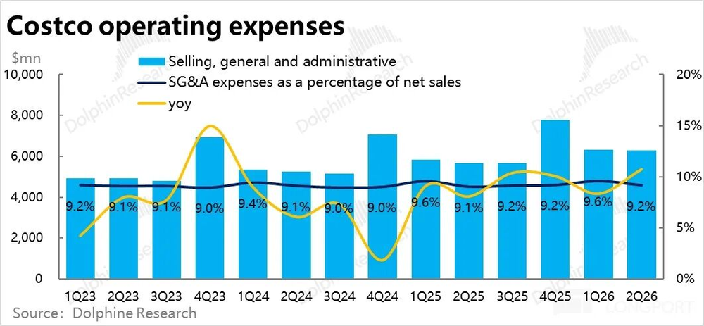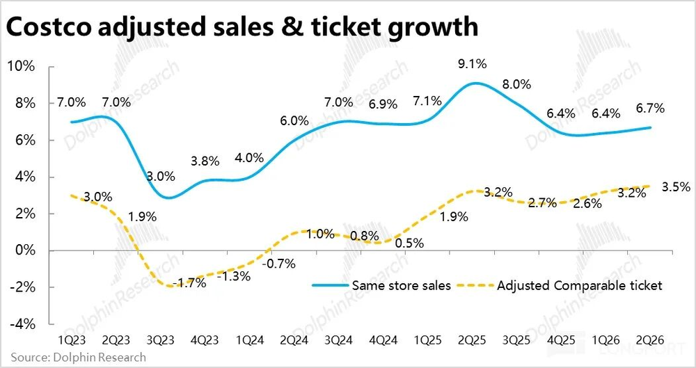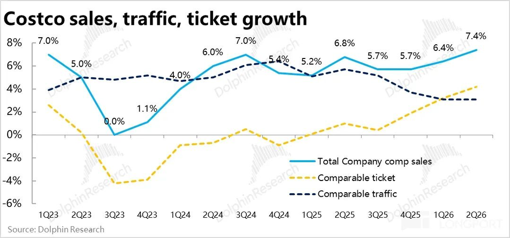 核心经营指标上,Costco本季度整体同店销售增速为7.4%,比上季的6.4%明显提速,也好于市场预期。不过分价量驱动因素来看,同店客流量增速实际环比持平在3.1%,并未提速。主要是靠客单价走高拉动的增长,本季增长4.2%vs.上季的3.2%。