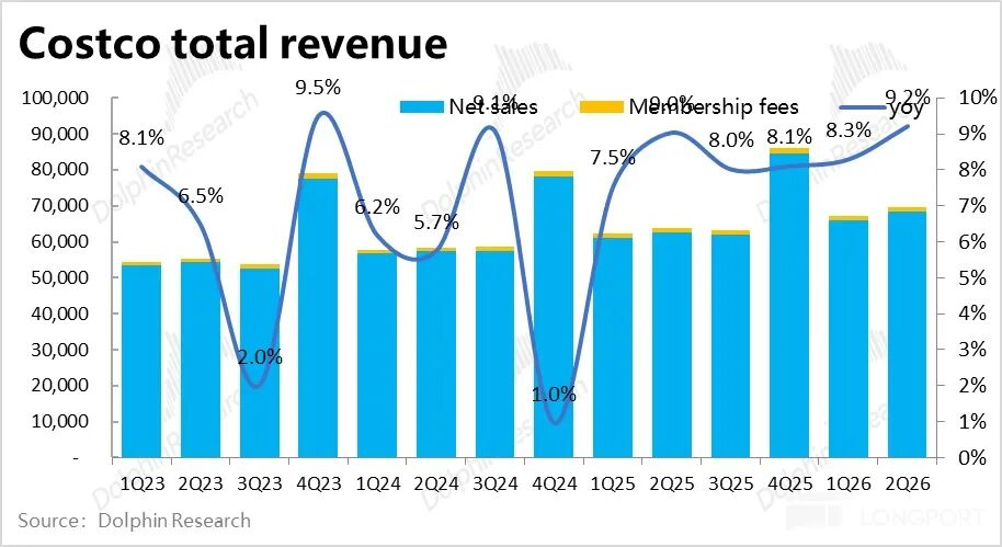 1、汇总以上零售收入和会费收入,本季Costco实现总收入$696亿,同比增长9.2%,环比有所提速且好于市场预期。