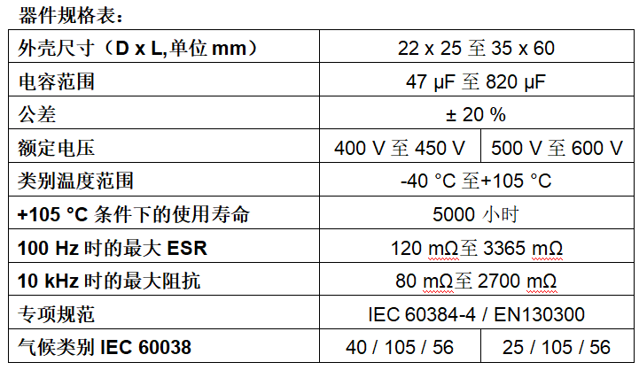 阵容新增额定电压为550 V和600 V的型号。该产品系列在同等大小封装尺寸下,纹波电流承载能力较标准解决方案提升高达30 %,而且使用寿命更长。