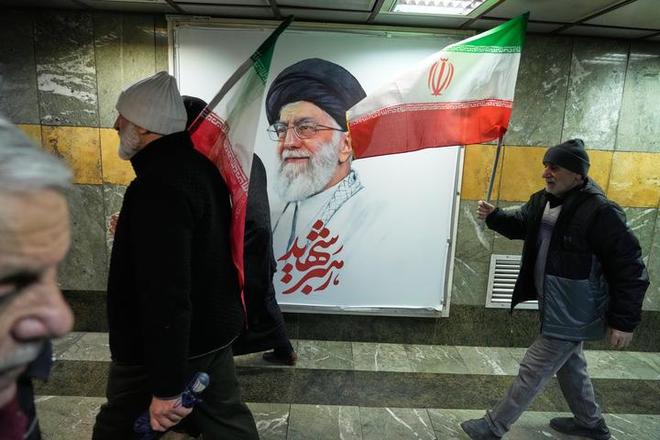 3月13日,德黑兰一名男子手持伊朗国旗走过已故最高领袖阿里·哈梅内伊的画像(美联社)