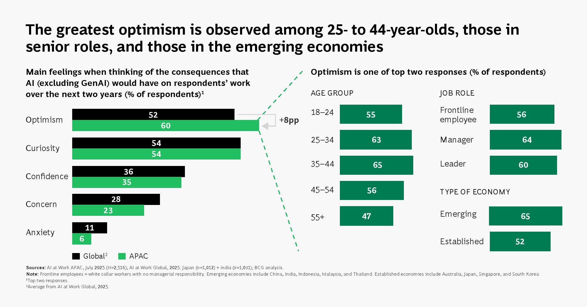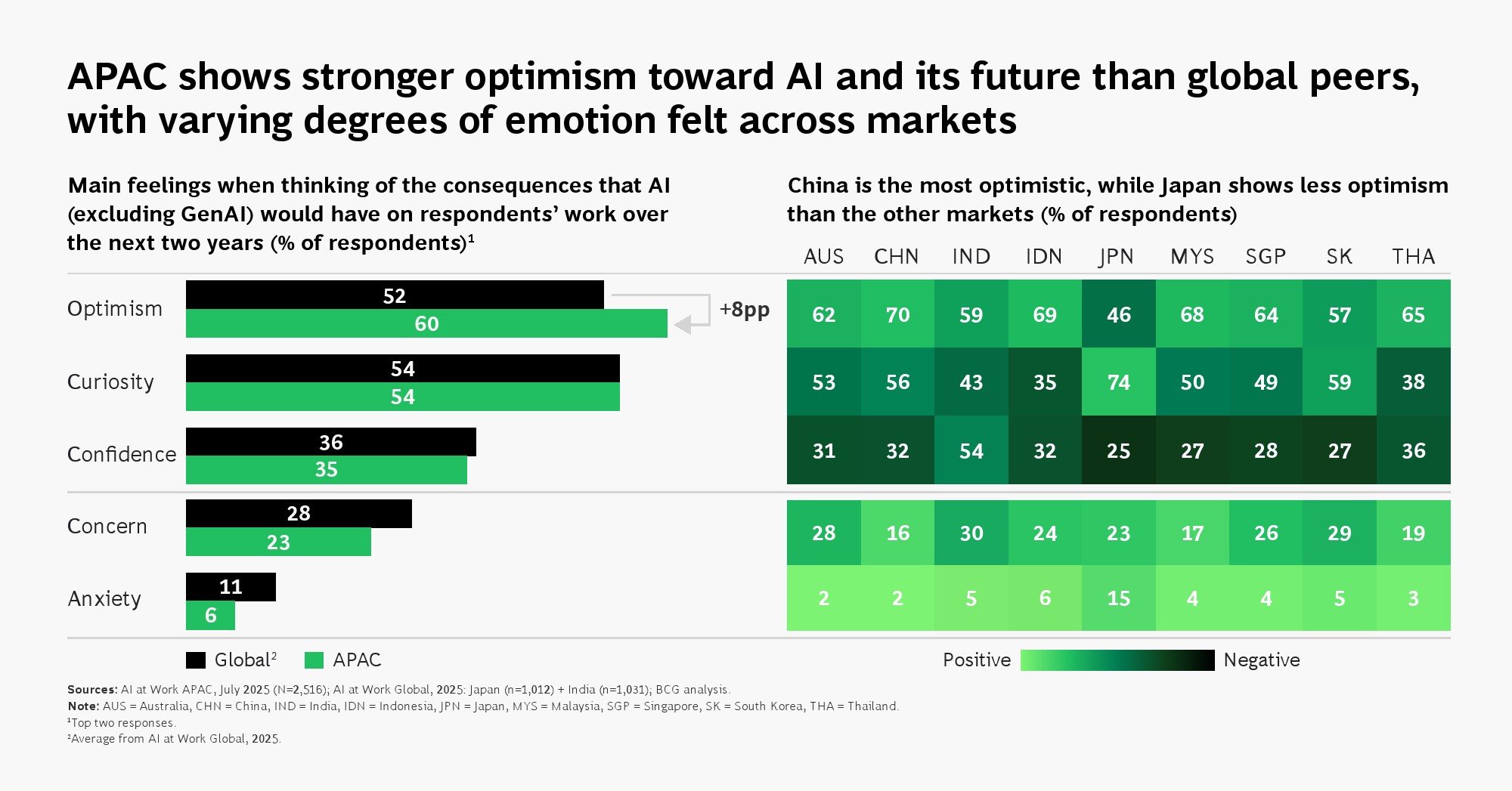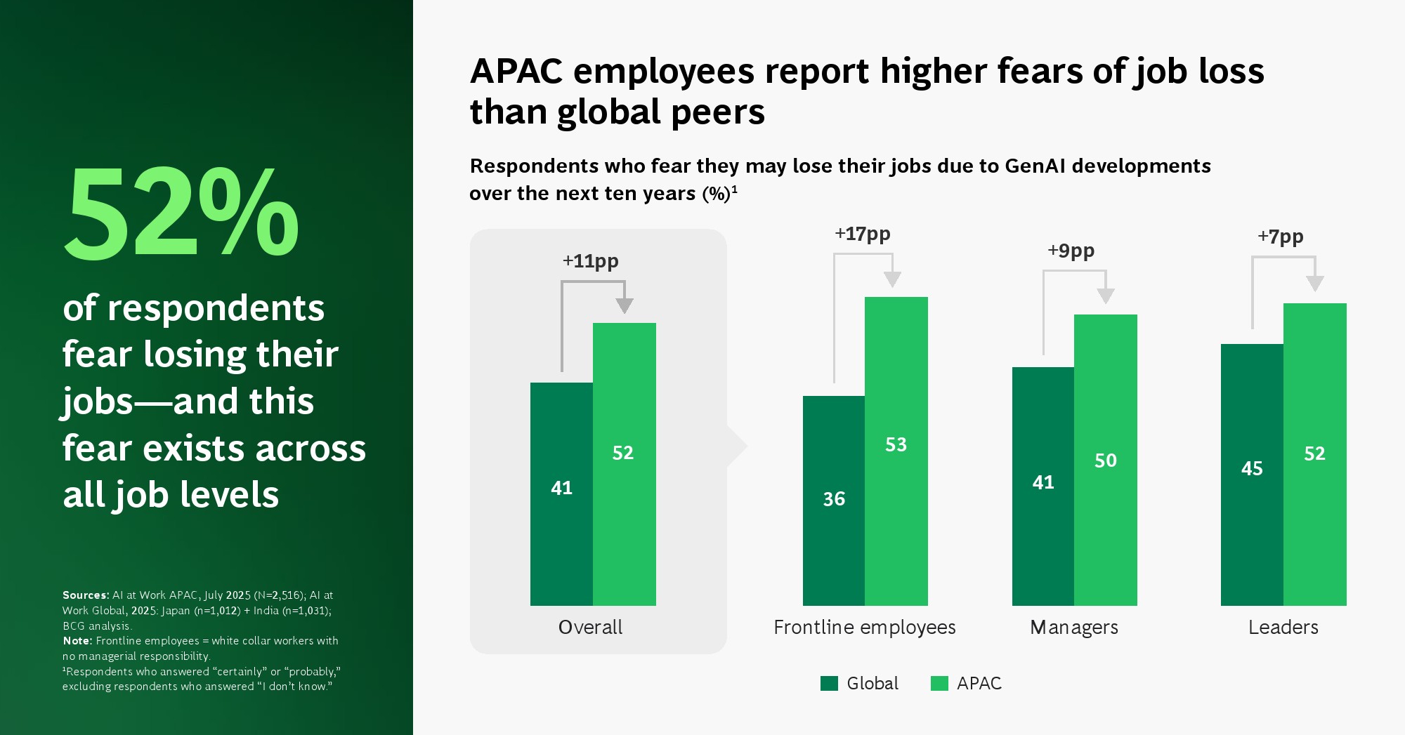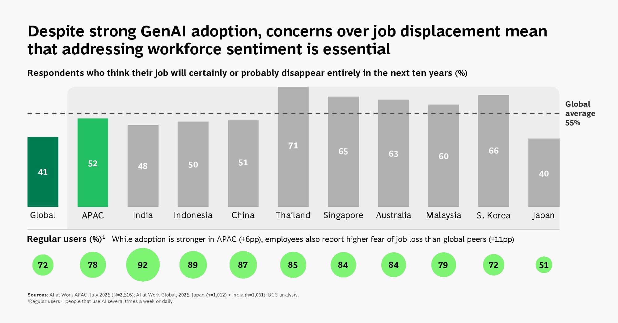 员工情绪呈现出典型的“双峰结构”。一方面,区域整体乐观情绪达到60%,较全球高出8个百分点,年轻群体与新兴经济体尤为明显;另一方面,52%的员工担忧未来十年可能失业,高于全球11个百分点。在中国,这一比例甚至达到71%。这种“既拥抱又恐惧”的心理状态,反映出AI既是效率工具,也是结构性替代力量,正在重塑劳动力市场预期。