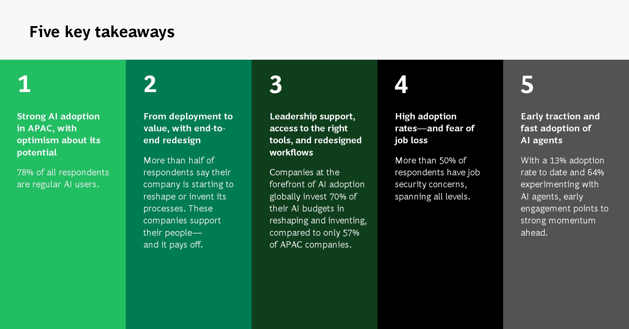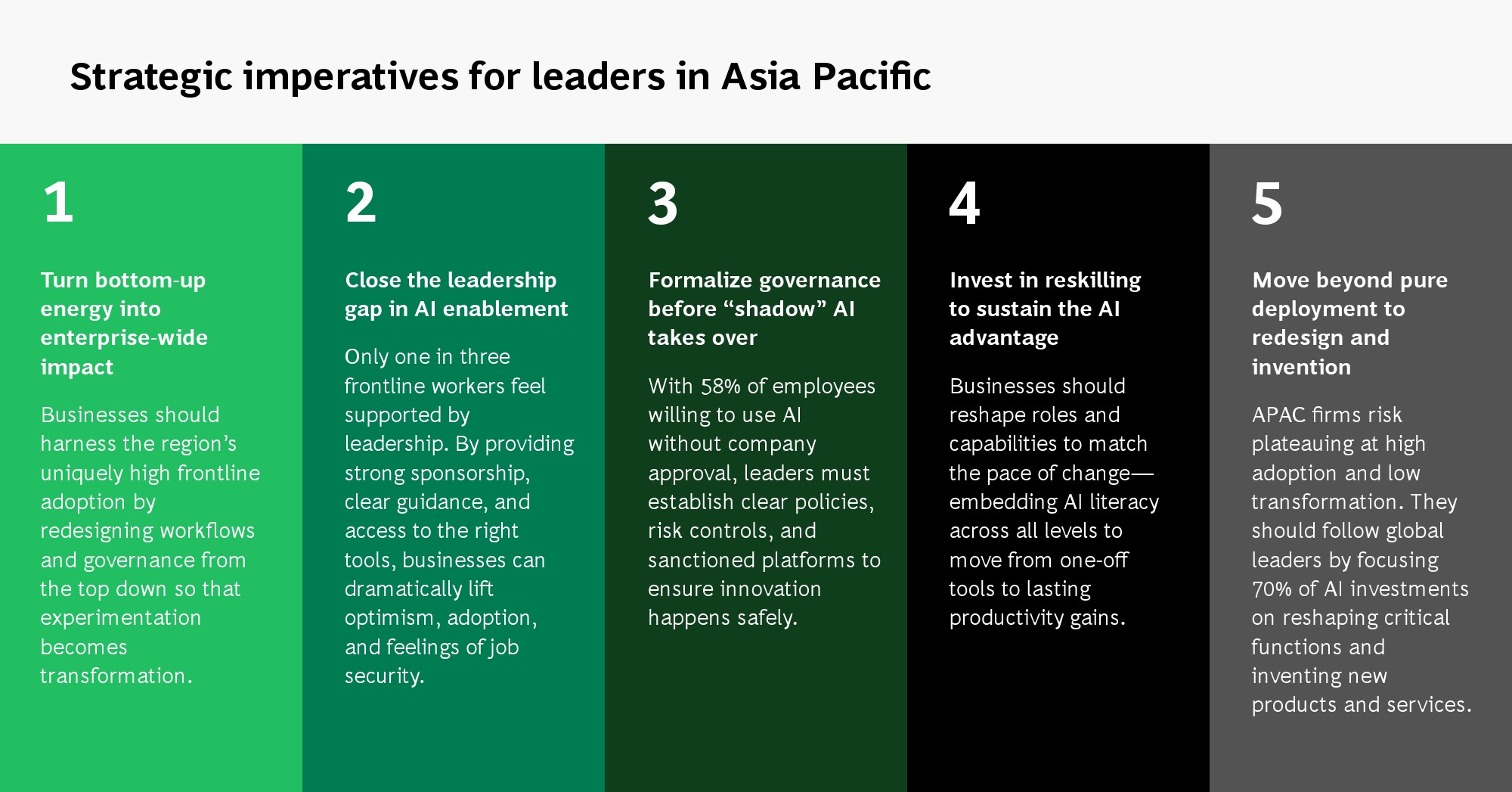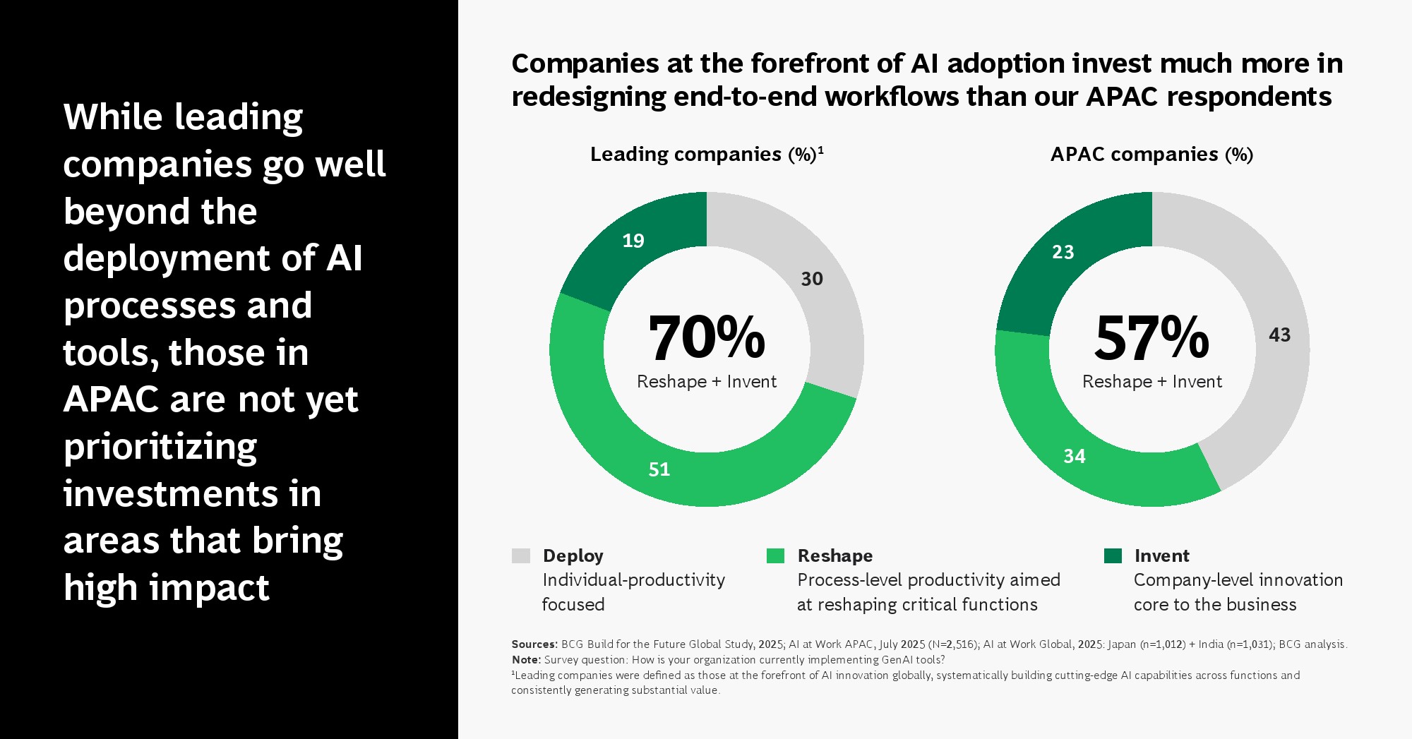 尽管应用广泛,亚太企业在价值转化上仍显滞后。全球领先企业将70%的AI预算投入流程重构与业务创新,而亚太企业仅为57%,更多资源仍集中在单点工具部署。这种结构导致AI收益集中于个体效率,而非组织级变革。换言之,亚太企业已实现“高使用率”,但尚未完成“高转型率”,若缺乏端到端流程再设计,技术红利将逐步触及天花板。