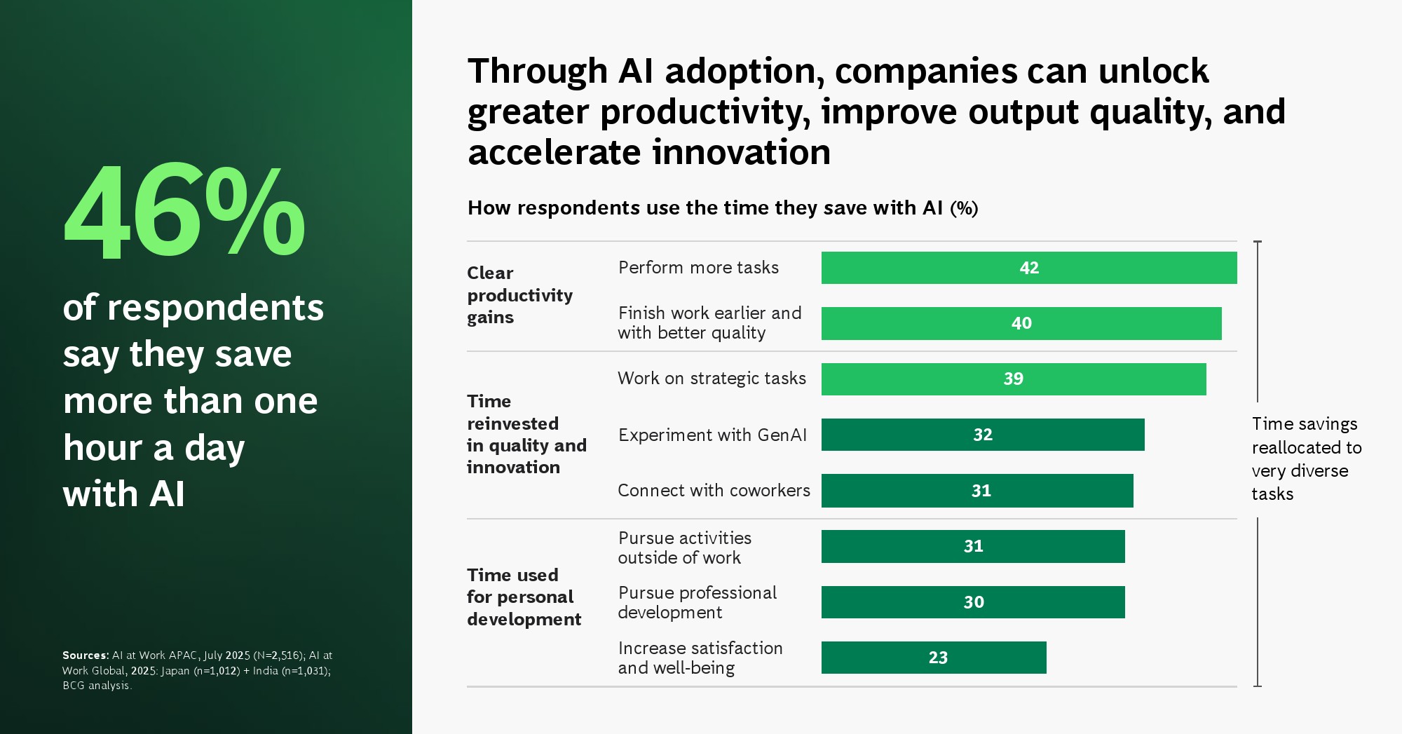 从应用层面看,当前AI价值主要集中在效率提升而非业务重构。58%的用户将AI用于行政事务,56%用于写作任务,48%用于创意工作,这些高度标准化场景成为最先被自动化替代的领域。进一步来看,46%的员工每天可节省超过1小时工作时间,而这些时间中,40%被用于提升工作质量,39%转向更具战略性的任务。这表明AI正在释放认知资源,但仍停留在“局部优化”的阶段,尚未形成系统性生产力跃迁。