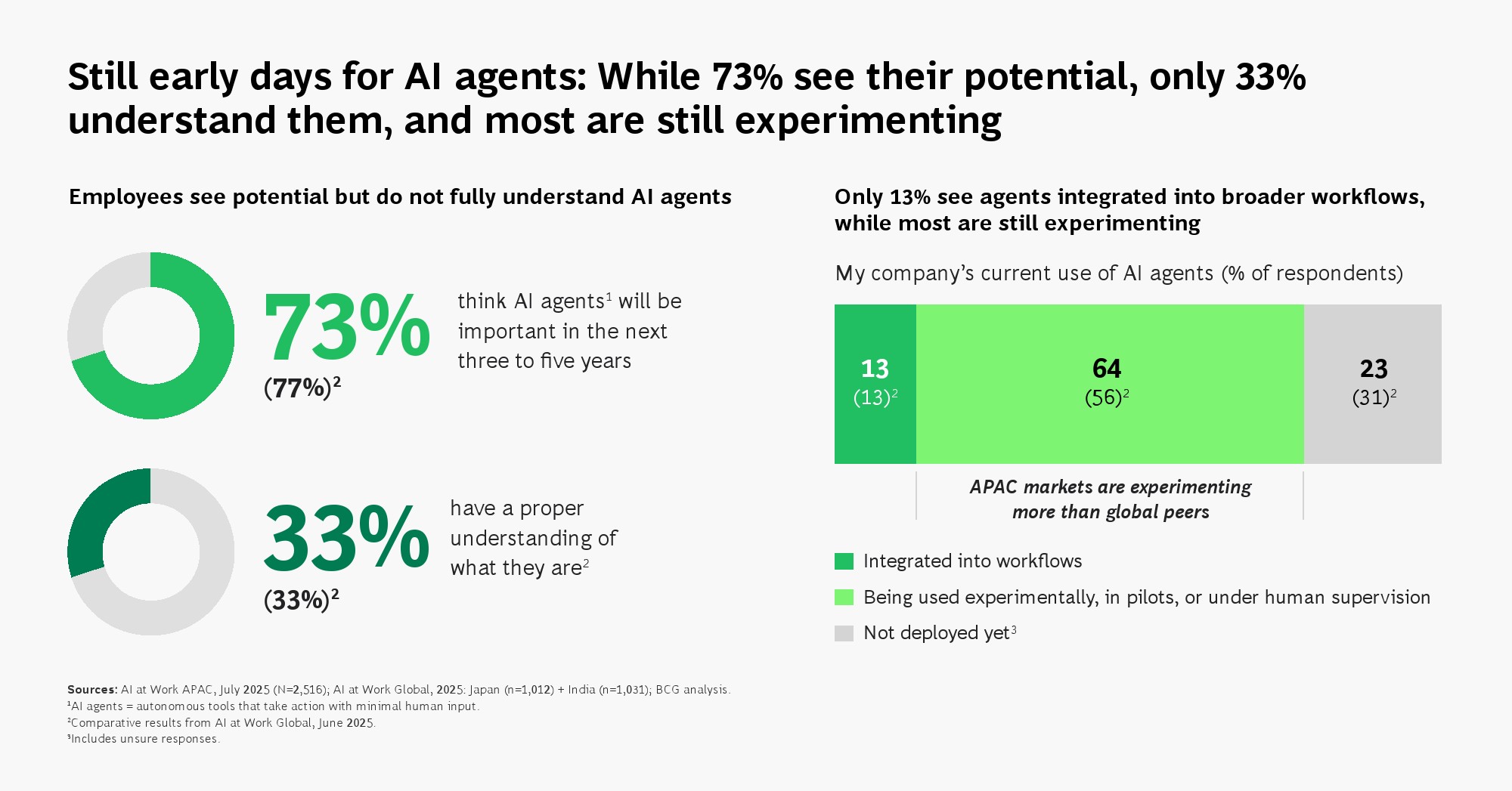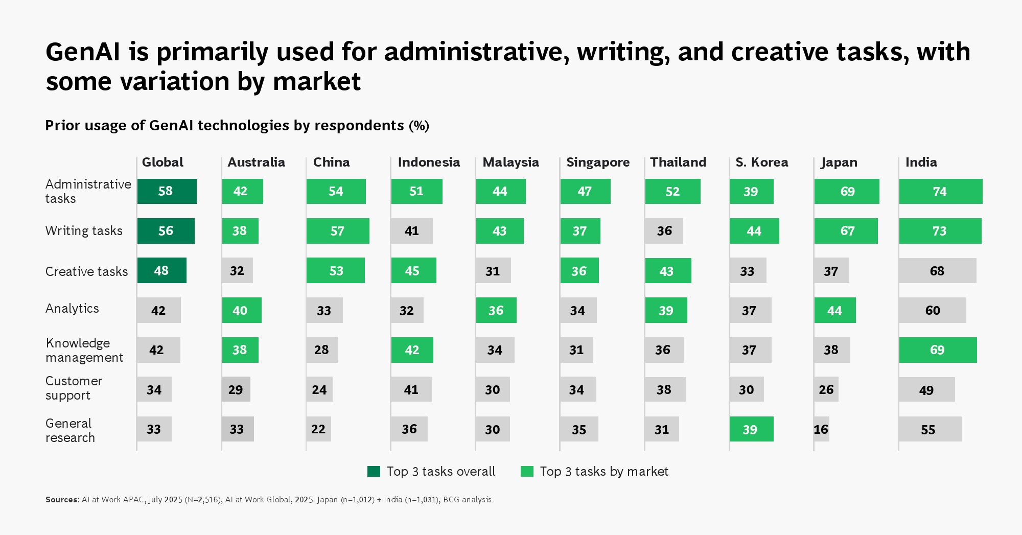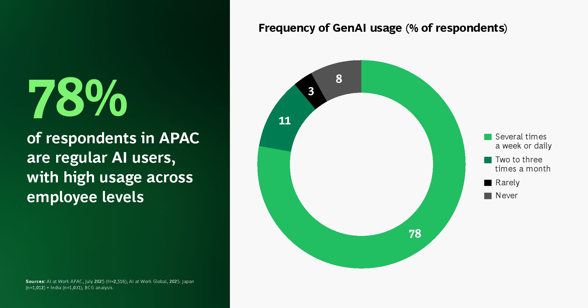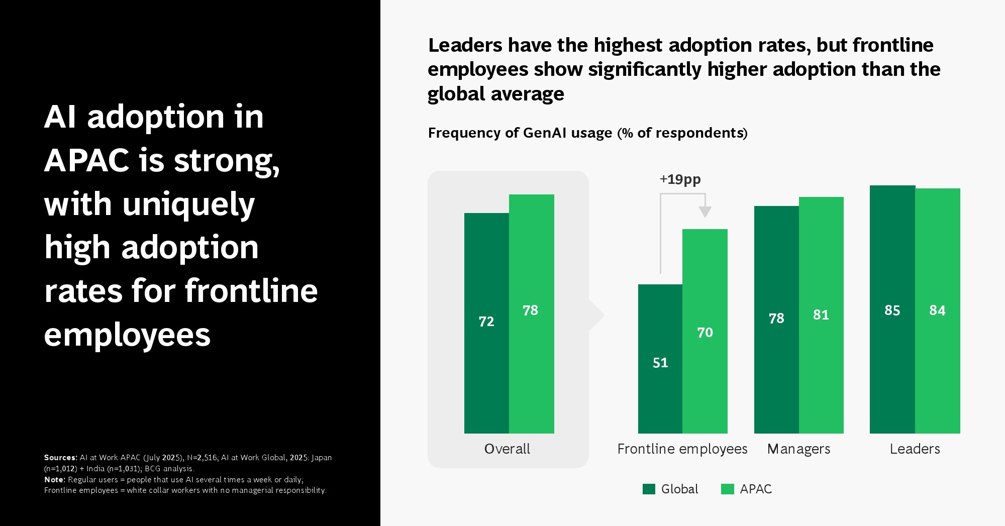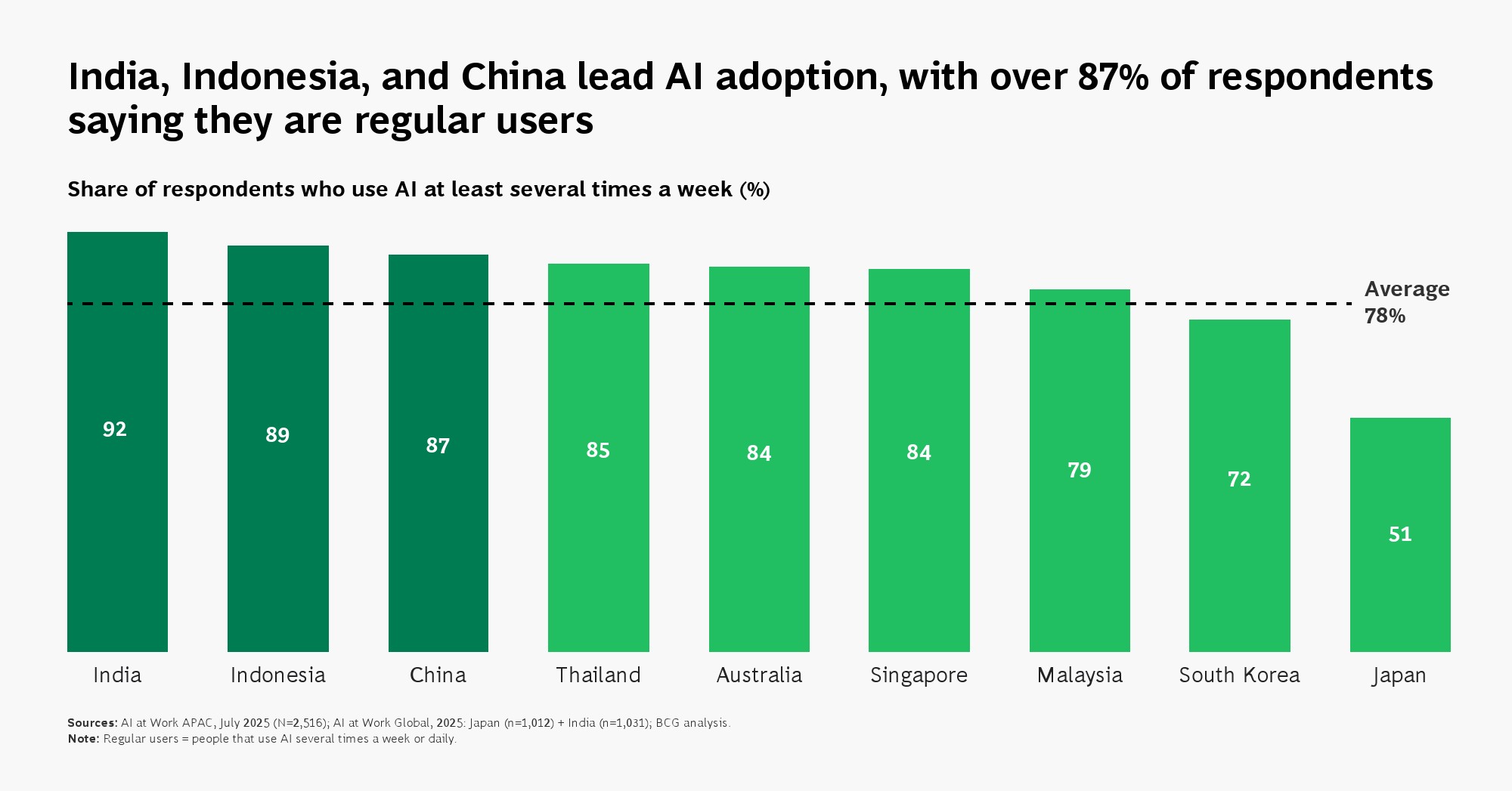 亚太地区正在成为全球AI应用最活跃的区域之一,但其领先优势更多体现在“使用广度”,而非“价值深度”。调研显示,78%的受访者已成为AI高频用户,显著高于全球平均水平。其中,一线员工使用率达到78%,较全球高出19个百分点,反映出AI在基层岗位的快速渗透。分市场看,印度、印尼与中国的使用率均超过87%,构成区域内最强增长极。这一结构意味着,AI正在从管理工具转变为普遍生产力基础设施。