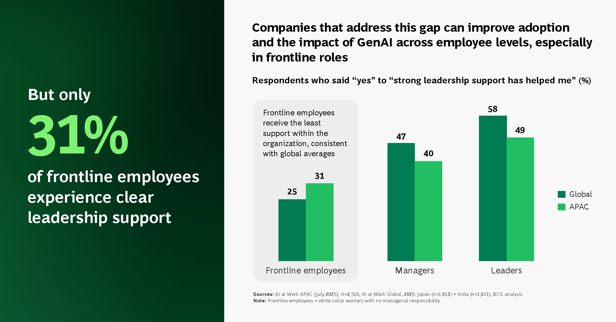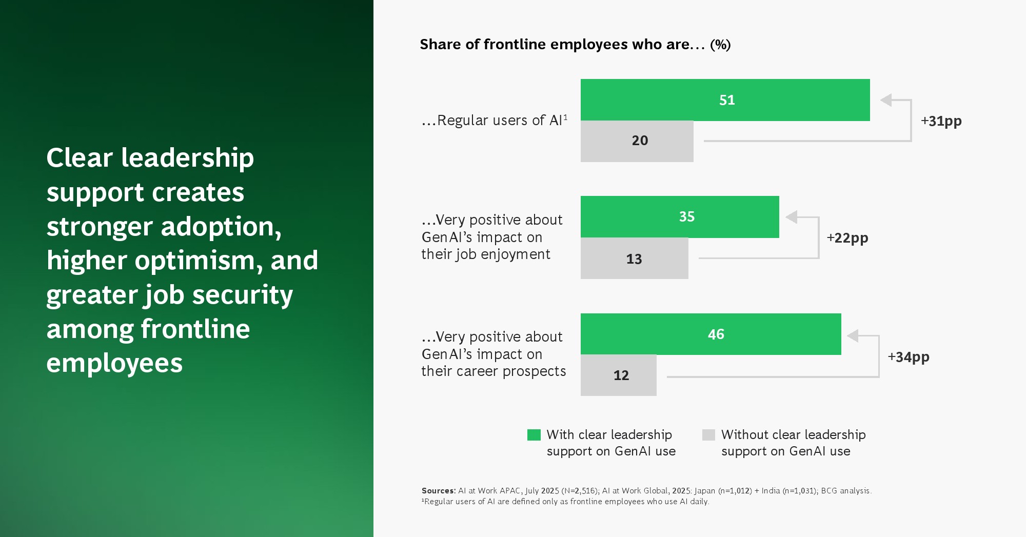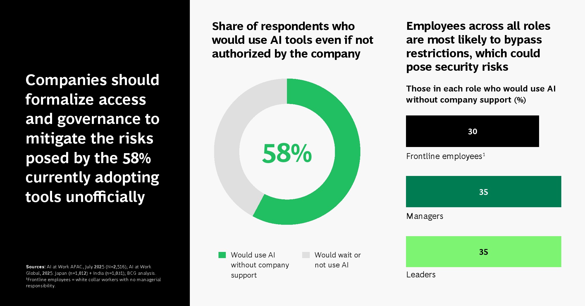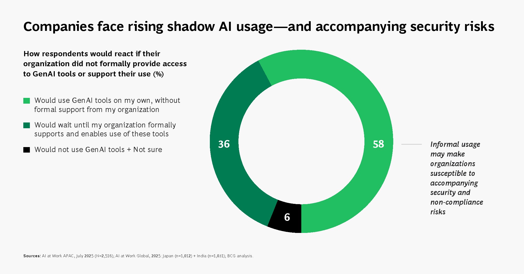 组织治理的滞后正在放大这一矛盾。仅31%的一线员工感受到明确的领导支持,但在获得支持的群体中,AI使用率提升31个百分点,对职业前景的正面预期提升22个百分点。与此同时,58%的员工表示即使企业未授权也会自行使用AI工具,形成“影子AI”现象,带来数据安全与合规风险。这说明,企业当前最大的短板不在技术,而在治理与制度供给。