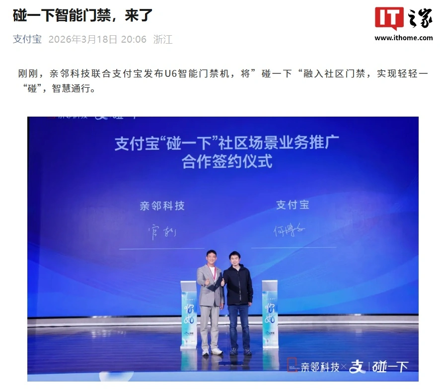 3 月 18 日消息,支付宝官方今日宣布:碰一下智能门禁来了。据介绍,亲邻科技联合支付宝发布 U6 智能门禁机,