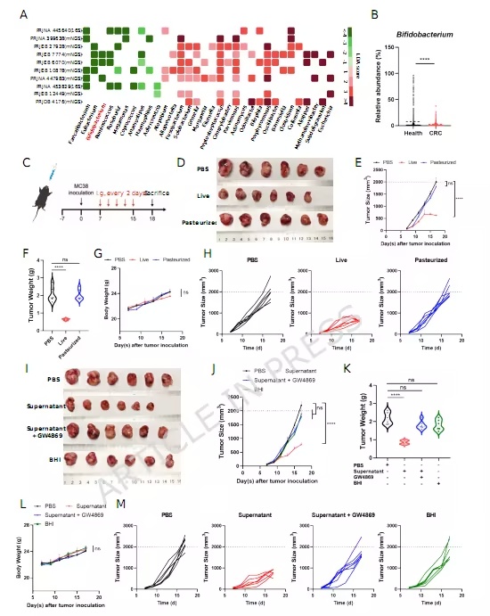 实验流程层层递进,研究人员首先证实,给荷瘤小鼠口服活的双歧杆菌能显著抑制肿瘤生长,但将细菌加热灭活后,这一效果便消失殆尽。更关键的是,如果先用GW4869(一种抑制囊泡生成的化合物)处理细菌,再将其培养上清液喂给小鼠,抗癌效果同样消失,这或许表明,真正起作用的不是细菌本身而是其分泌的囊泡。