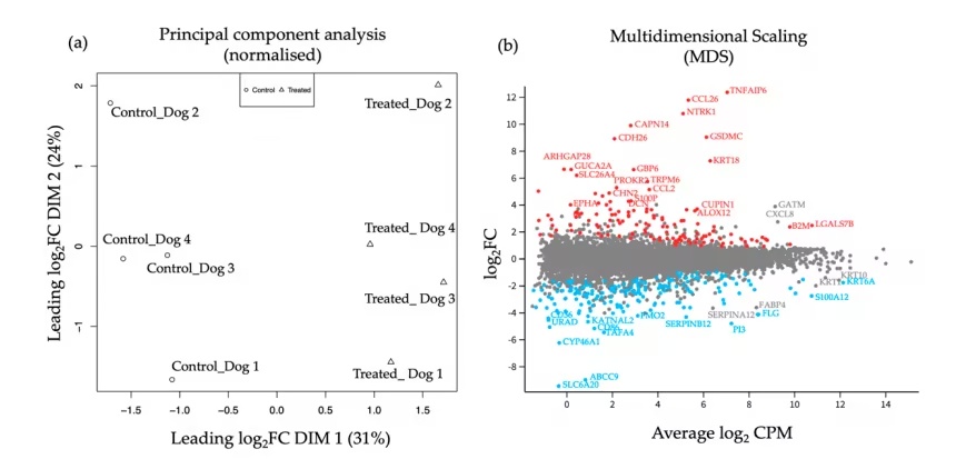 这场“细胞叛乱”的整个过程通过一项名为RNA测序的“转录组监控摄像头”被完整记录。对比未受刺激的对照组,研究者发现了224个基因的表达发生了显著改变。经过严格筛选,最终锁定69个关键基因。有趣的是,这些基因大多在人类和犬的特应性皮炎中都有报道,印证了犬类作为研究模型的宝贵价值。