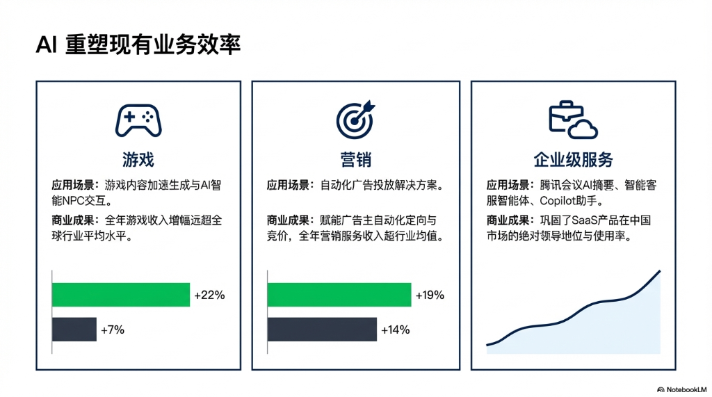 此外,在营销服务领域,腾讯通过部署长序列AI模型和生成式AI工具,极大提升了广告的精准投放和创作效率,其推出的“AI广告投放解决方案”帮助广告主实现自动化竞价与投放,从而提升投资回报率,并吸引更多预算倾斜,最终驱动2025年营销服务收入同比增长19%,远超中国行业平均14%的增速。
