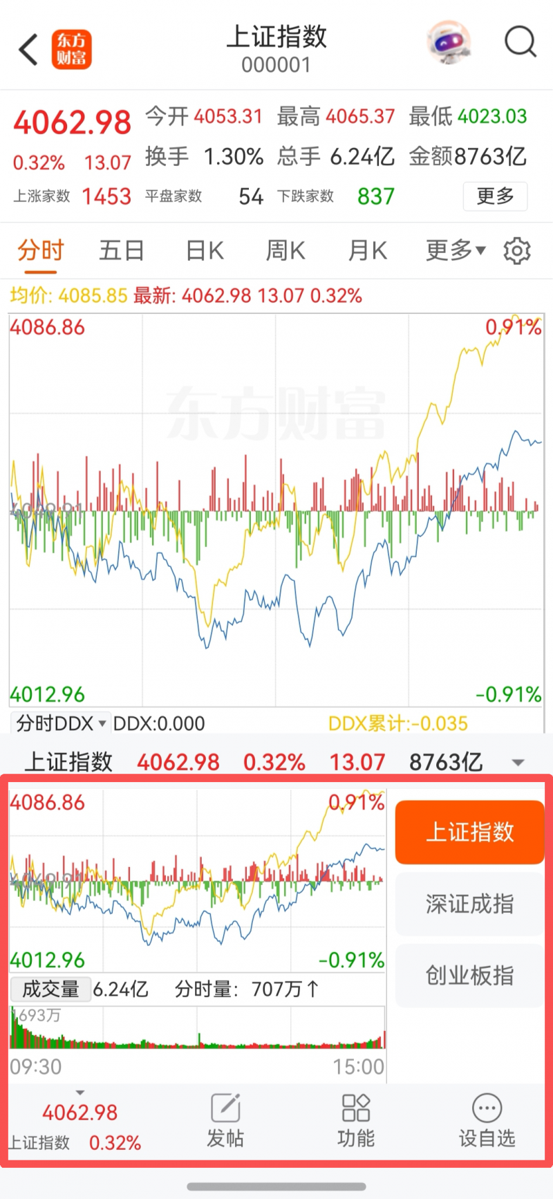 • 点击个股页面左下角指数区域,可快速在不同指数间切换,灵活掌握大盘动向。