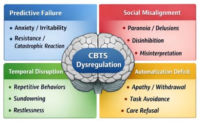 因此,BPSD的形成可以被理解为:在神经退行过程中,记忆、执行、情感与知觉系统逐步受损,而小脑-皮层行为调谐系统无法再对这些受损输出进行有效滤波、排序和社会适配,于是症状从“脑内失衡”变成“行为外显”。这使得BPSD更接近一种网络动力学失稳的临床窗口,而不是单纯的附属症状。