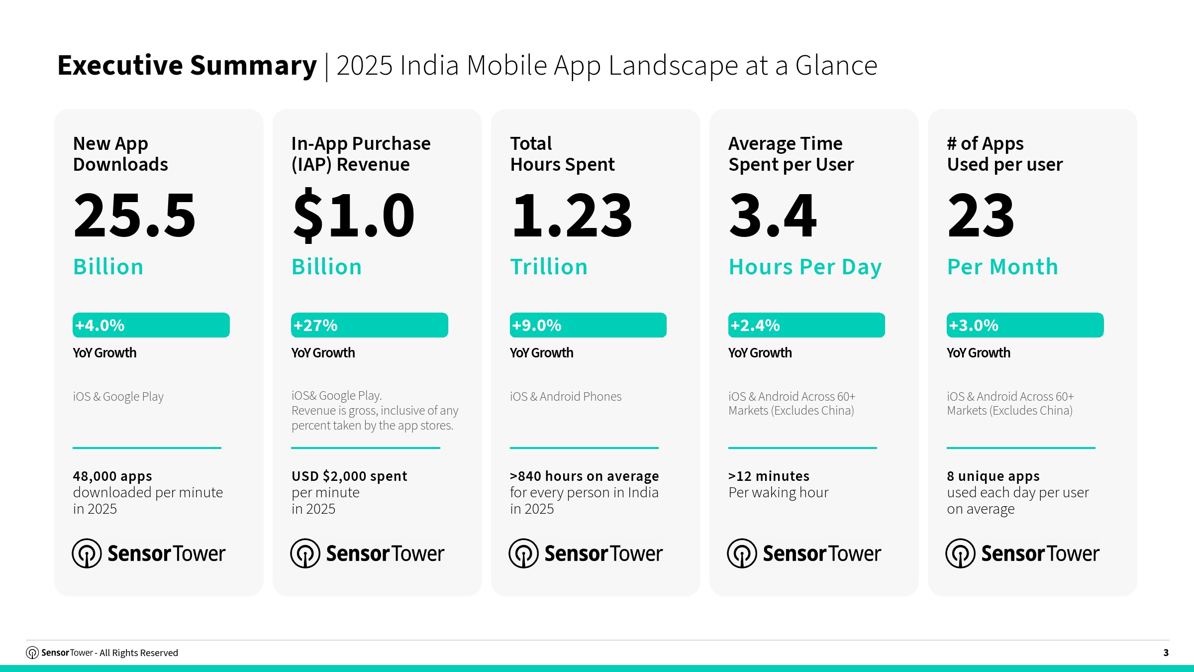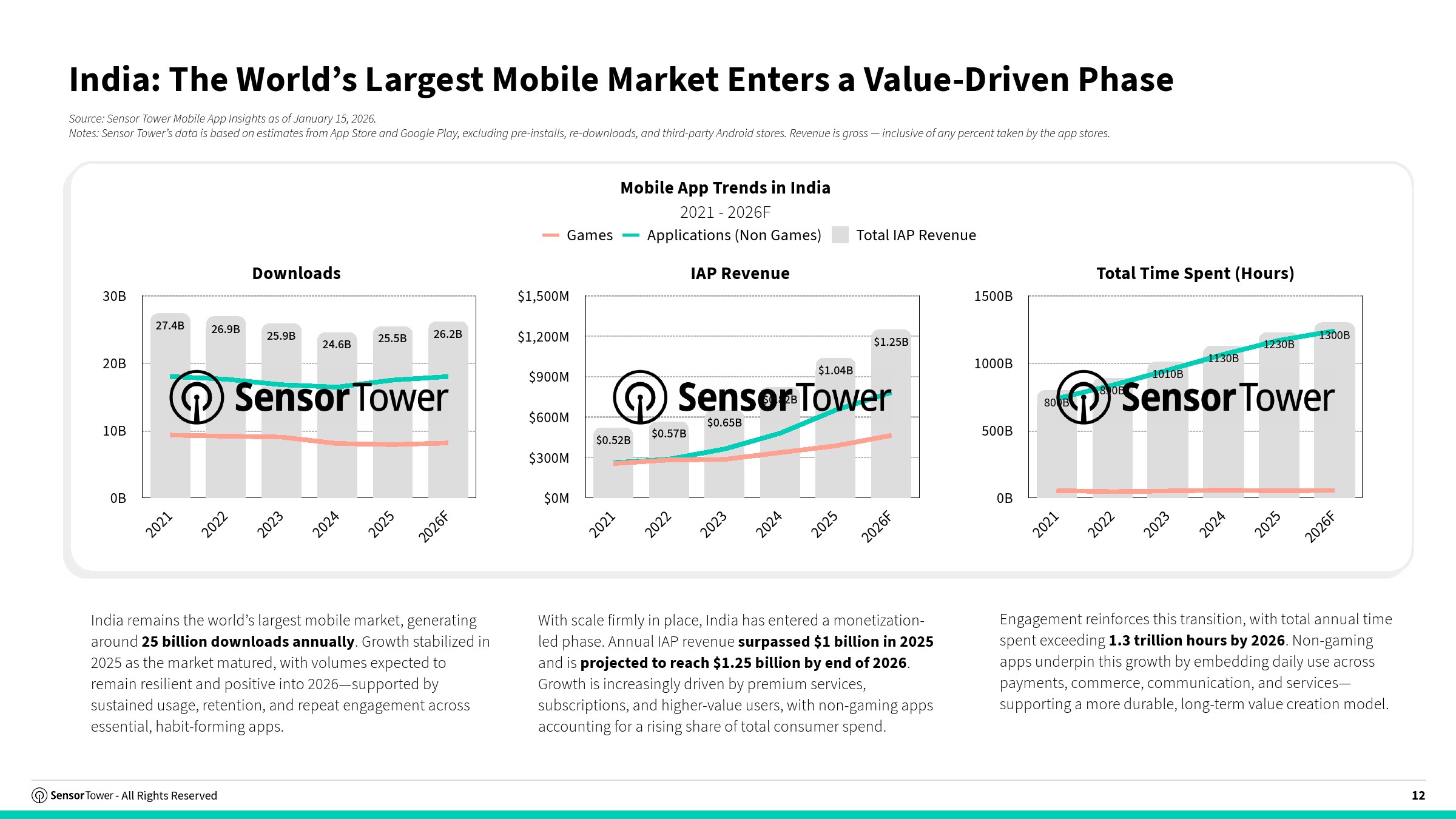 印度移动应用市场正从“规模驱动”迈入“价值驱动”阶段,呈现出成熟市场特征。2025年全年下载量达255亿次,同比增长4%,但较此前高速扩张明显趋稳;与此同时,总使用时长达到1.23万亿小时,同比增长9%,人均年使用时长超过840小时,表明用户粘性持续增强。更关键的是,应用内购收入突破10亿美元,同比增长27%,预计2026年将升至12.5亿美元,显示变现能力进入加速释放阶段 。