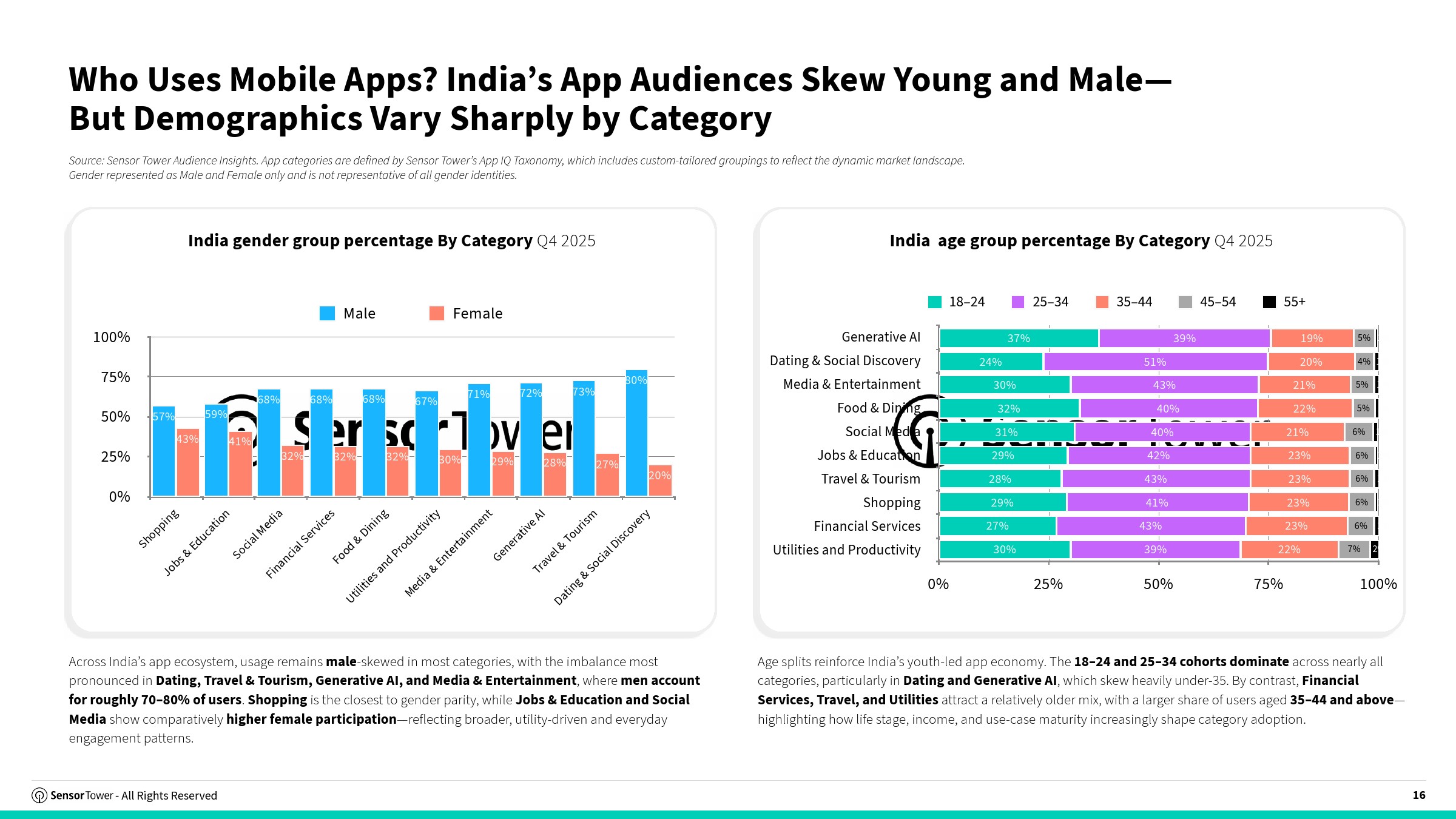 区域与人口结构进一步塑造市场格局。二三线城市成为新增用户主力来源,部分头部应用超过30%用户来自低线城市;同时,18至34岁用户占据主导,多个品类中占比超过60%。性别结构则呈现男性主导特征,在AI、娱乐、旅游等领域男性占比高达70%-80%,但电商与教育更接近平衡,显示消费型应用具备更广泛渗透能力 。