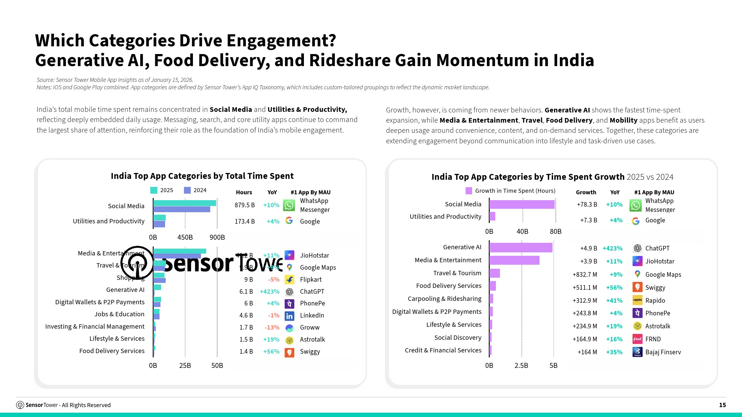 用户行为层面,增长逻辑已从“安装驱动”转向“习惯驱动”。当前印度用户平均每月使用23个应用、每日活跃8个应用,日均使用时长达3.4小时。高频场景集中在支付、电商、内容与出行等刚需服务,这些应用逐步嵌入日常生活,形成稳定使用闭环。社交与工具类仍占据近千亿小时级别使用时长,但增长动能明显向AI、短视频、外卖及出行等新场景迁移 。