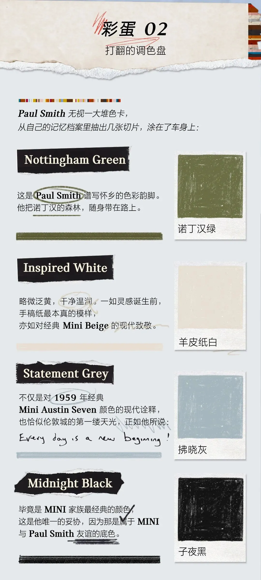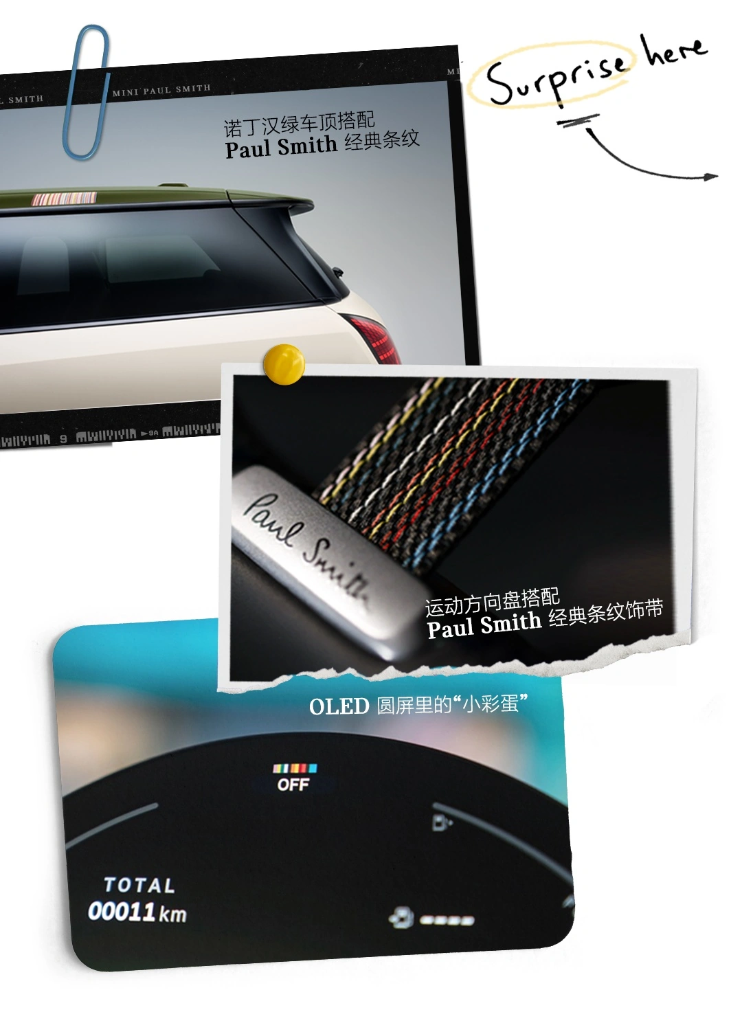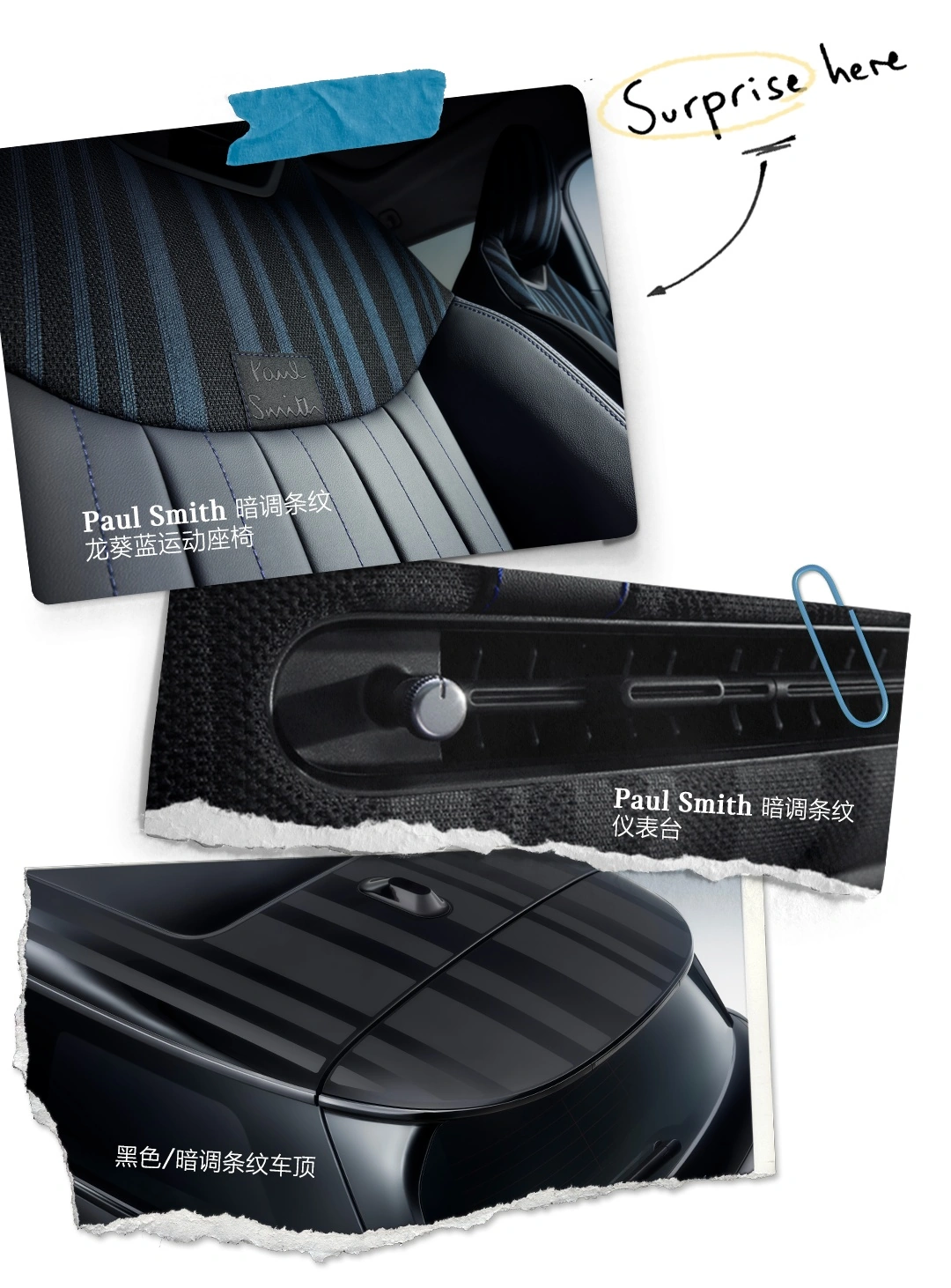 新车沿用 Paul Smith 的标志性经典条纹,在仪表台、车顶等处印有黑白条纹,方向盘及 OLED 圆屏里则是彩条装饰。