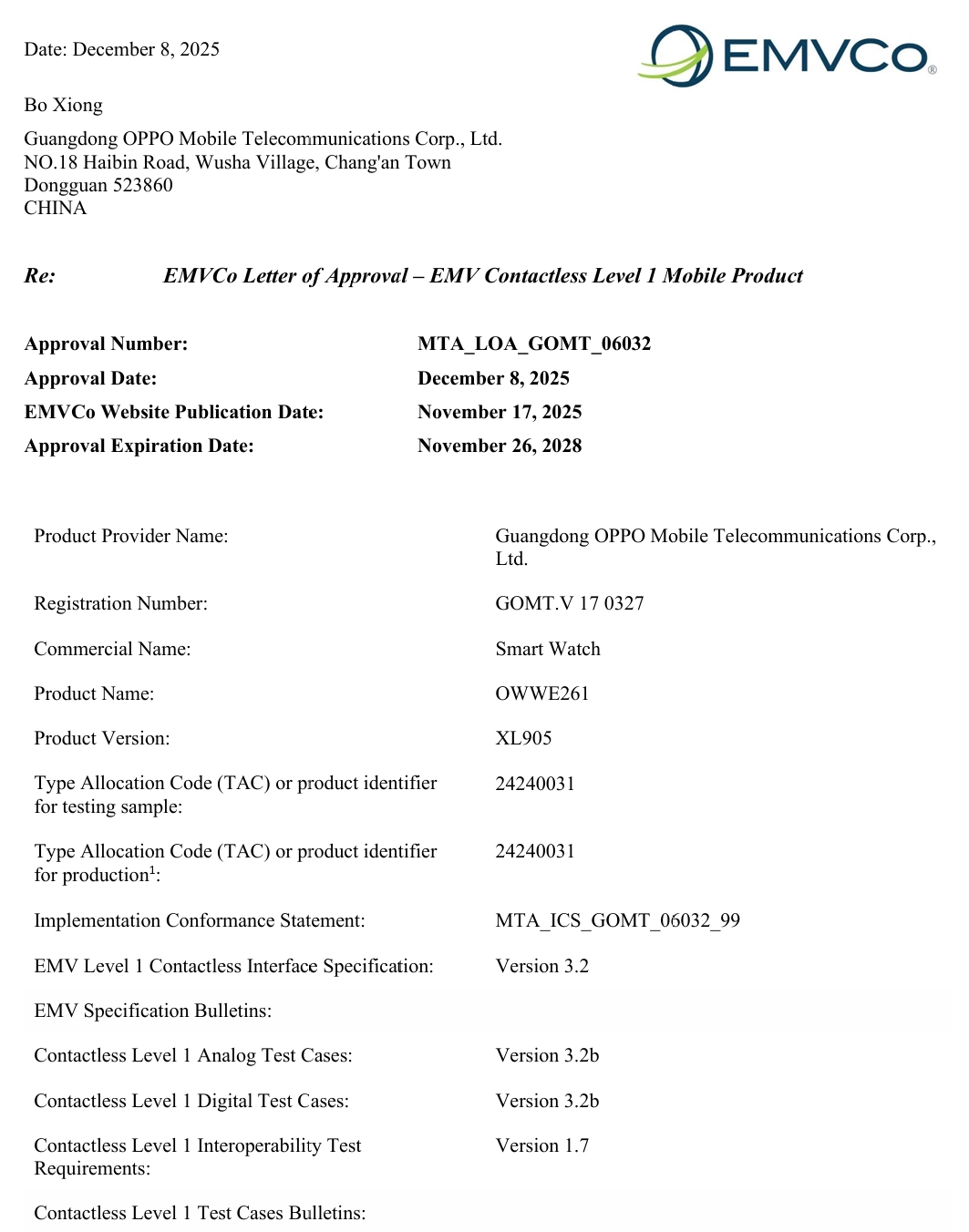 3 月 20 日消息,据科技媒体 GSMArena 今天报道,一加 Watch 4 手表目前现身 EMVCo 认证数据库。