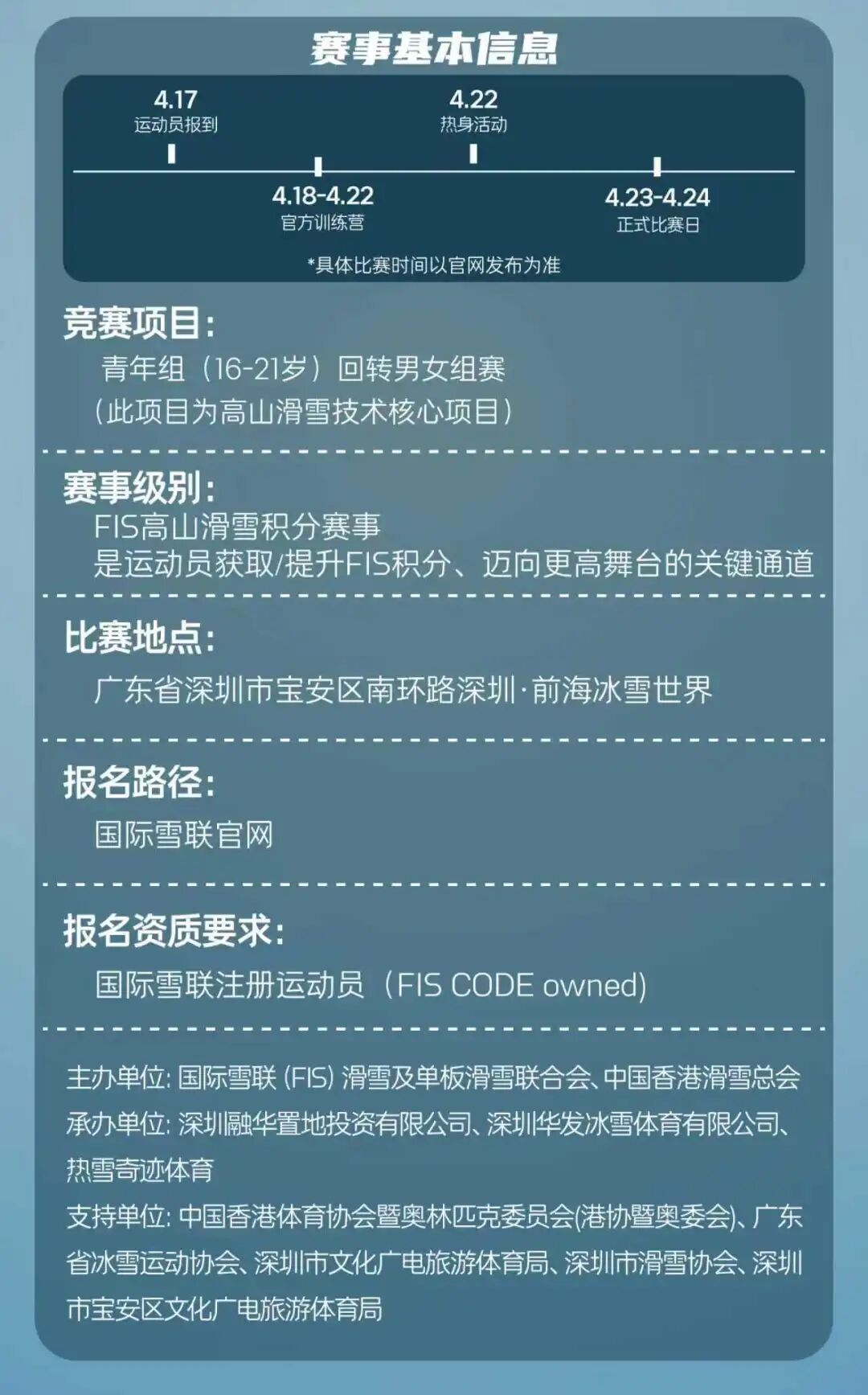 中国首场室内国际滑雪赛「FIS华发冰雪热雪奇迹杯•亚洲室内高山滑雪锦标赛」将于4月23日-24日在深圳·前海冰雪世界震撼开赛,一场硬核冰雪盛宴将在深圳开启。