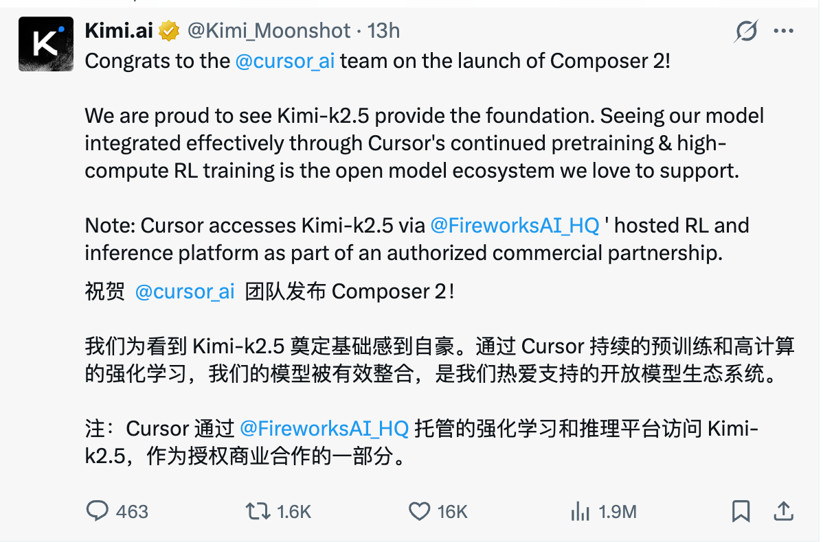 最终事件得到了一个体面的结局——Kimi.ai官方账号发文称,祝贺Cursor团队发布Composer 2。很高兴看到KimiK2.5为其提供底层基座,模型通过Cursor 的持续预训练与高算力强化学习(RL)训练得到有效集成,这正是团队乐于支持的开放模型生态。作为授权商业合作的一部分,目前Cursor 已通过FireworksAI(云原生 AI 基础设施平台)托管的强化学习和推理平台访问 Kimi-k2.5。Kimi工作人员也删除了此前的吐槽内容。