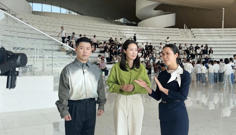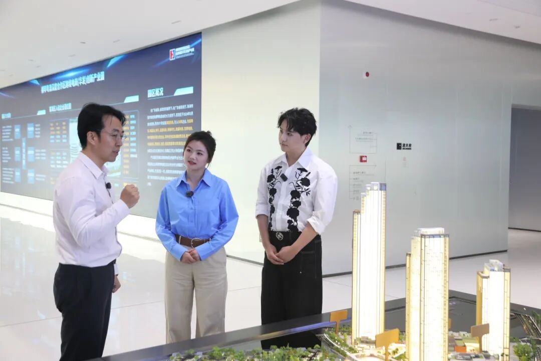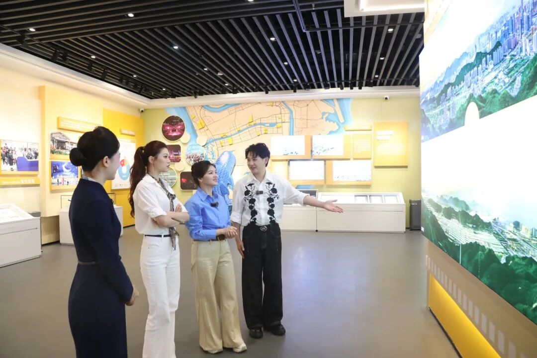 在横琴岛的核心区,造型独特的天沐琴台倒映在天沐河上。这座集会议中心、办公、商业于一体的建筑,正如其名,弹奏出横琴与澳门琴瑟和鸣的序曲。在这里,记者和主播们参观了“琴澳和鸣——横琴粤澳深度合作区建设主题展”,通过沙盘、数字影像以及互动装置,了解横琴15年开发历程及合作区成立后的建设成果。