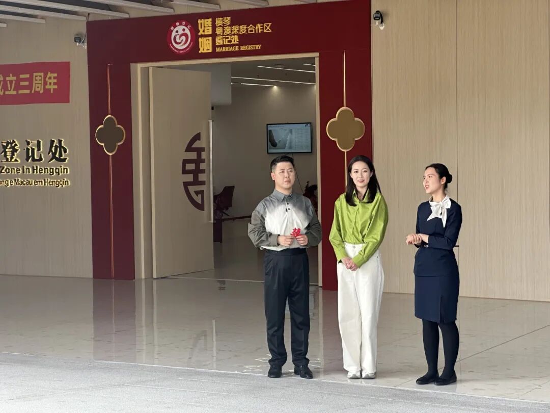 在横琴文化艺术中心,“采风团”成员们被这里的浪漫气息所吸引——合作区婚姻登记处就位于横琴文化艺术中心4层,目前已开通内地及涉外婚姻登记服务,并开展“跨省通办”试点,已有来自澳门和珠海的新人就在这里登记,组成横琴新家庭。