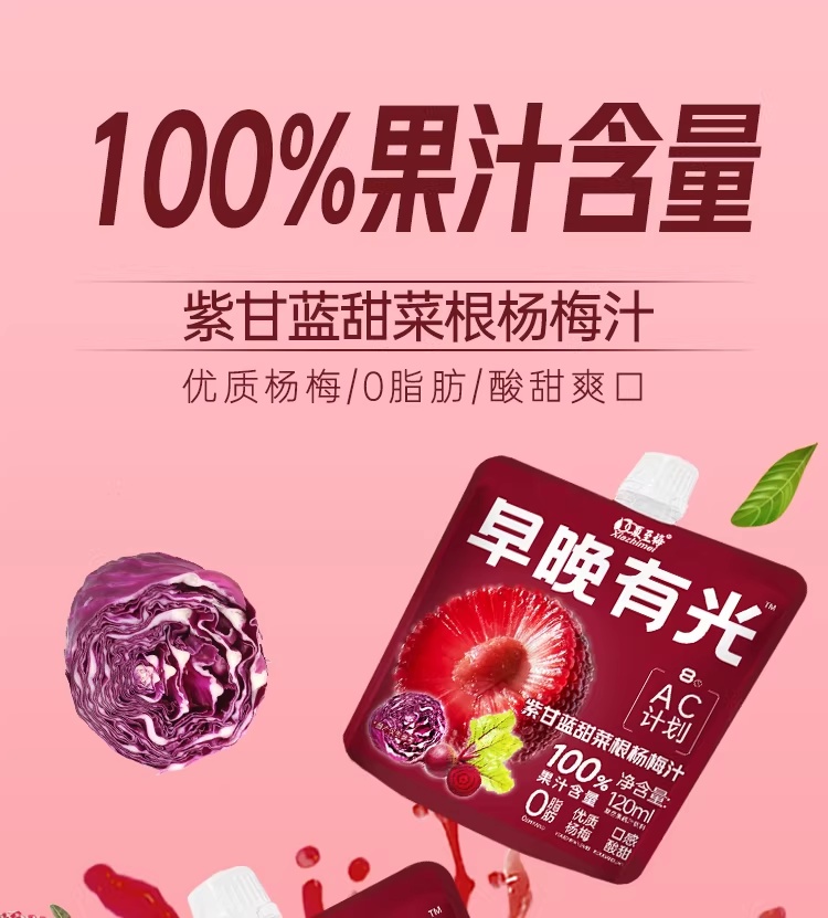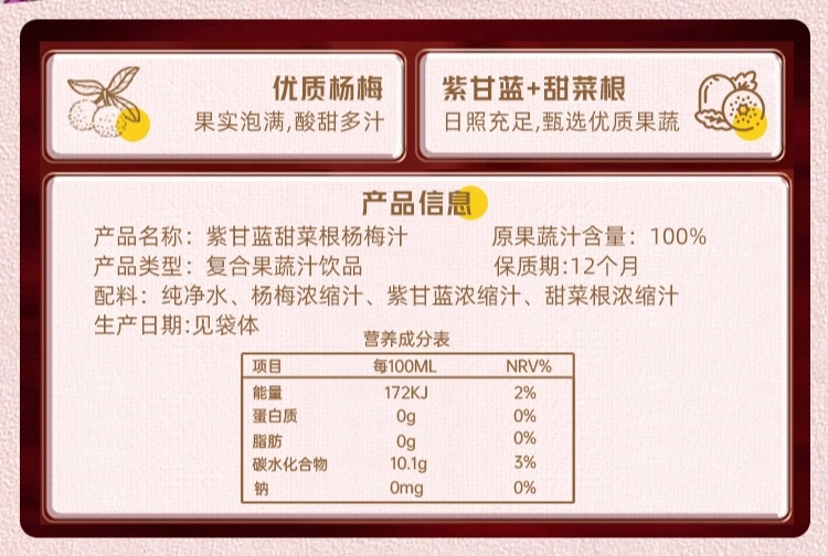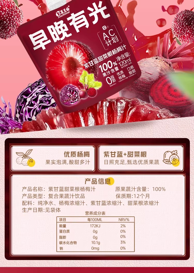 果汁含量 100%:杨梅 + 紫甘蓝 + 甜菜根果汁 1 元 / 袋官方大清仓